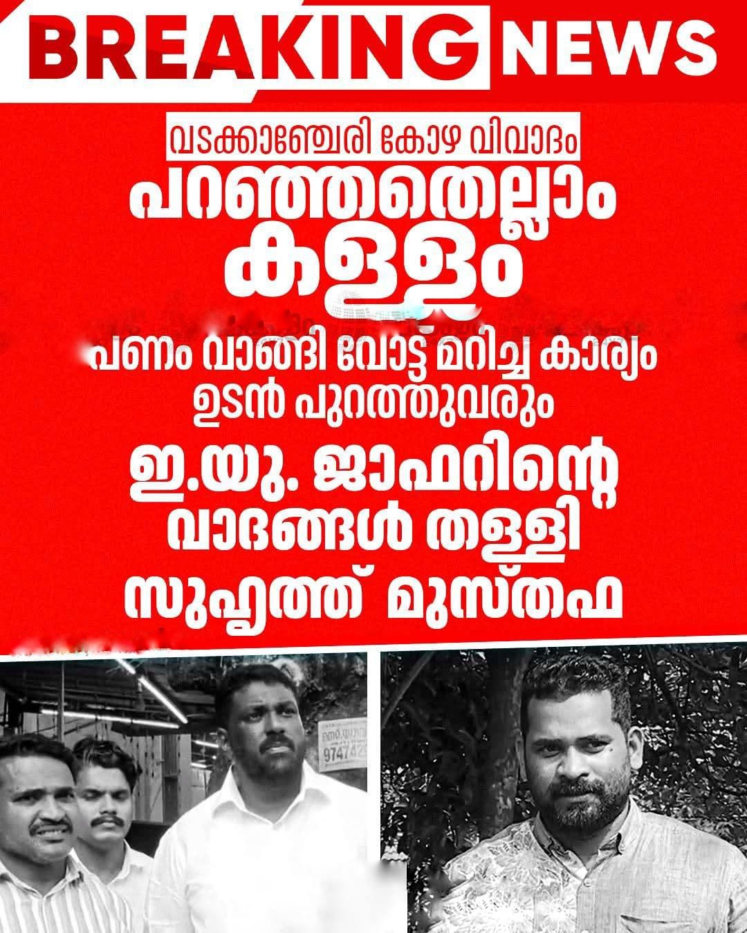 നസീർ ജാഫർ (ഇ.യു. ജാഫർ) ഉന്നയിച്ച ആരോപണങ്ങൾ വാസ്തവവിരുദ്ധമാണെന്നും പണം വാങ്ങി വോട്ട് മറിച്ചതിന്റെ വിവരങ്ങൾ ഉടൻ പുറത്തുവിടുമെന്നും സുഹൃത്തായിരുന്ന മുസ്തഫ വെളിപ്പെടുത്തി.