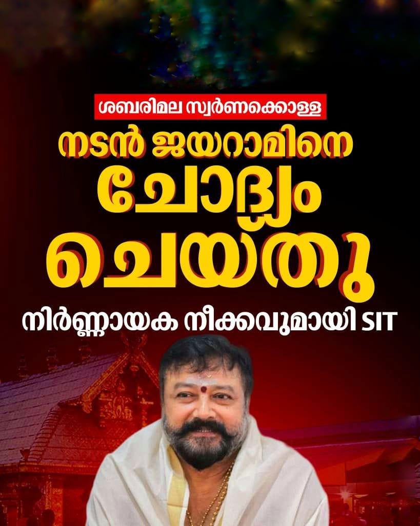 പാളികൾ വീട്ടിലെത്തി പൂജിക്കാൻ പോറ്റി തന്നെ ആവശ്യപ്പെടുകയായിരുന്നുവെന്നും ജയറാം പറഞ്ഞു. മൊഴി പരിശോധിച്ച ശേഷം വീണ്ടും ചോദ്യം ചെയ്തേക്കും.