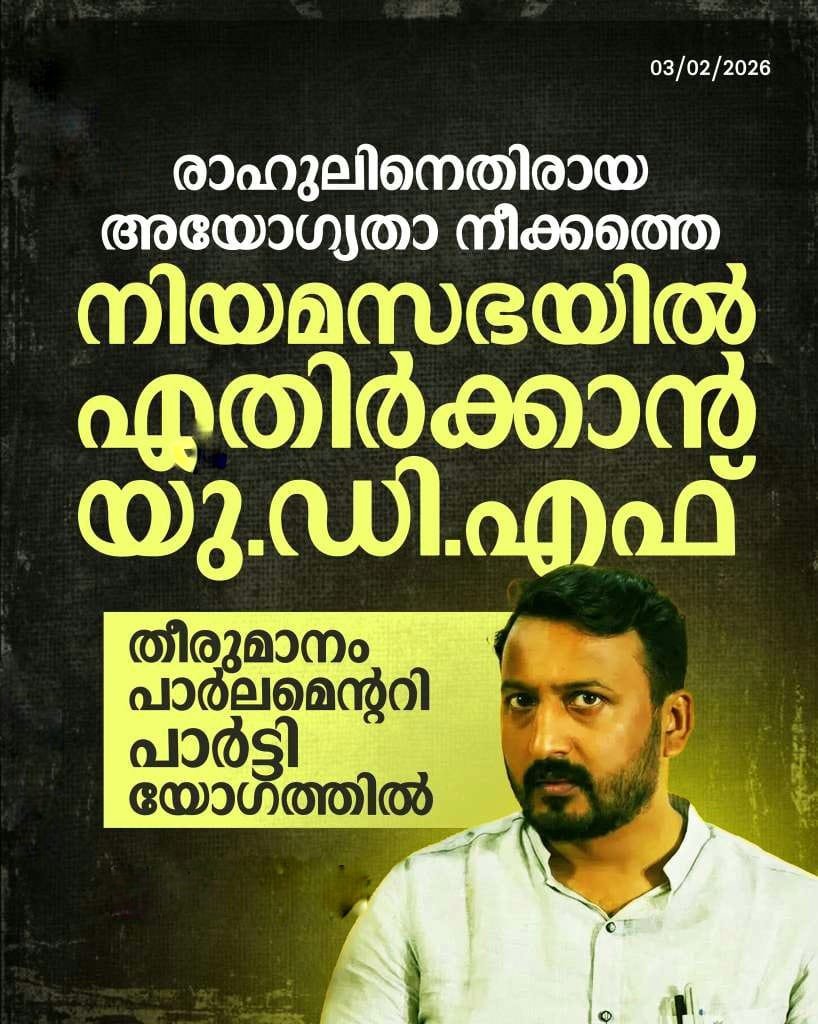 രാഹുൽ മാങ്കൂട്ടത്തിലിനെ അയോഗ്യനാക്കാനുള്ള സർക്കാർ നീക്കത്തെ നിയമസഭയിൽ സംയുക്തമായി നേരിടാൻ യു.ഡി.എഫ് പാർലമെന്ററി പാർട്ടി യോഗം തീരുമാനിച്ചു.