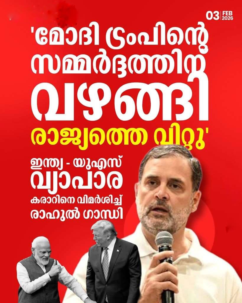 കരാറിലെ നിബന്ധനകൾ പരസ്യപ്പെടുത്താത്തതിലെ ദുരൂഹത ചൂണ്ടിക്കാട്ടിയ രാഹുൽ, ഇത് ഇന്ത്യയുടെ സാമ്പത്തിക സുരക്ഷയെയും കർഷകരുടെ ഉപജീവനത്തെയും ദോഷകരമായി ബാധിക്കുമെന്ന് മുന്നറിയിപ്പ് നൽകി. ജനങ്ങളെ ഇരുട്ടിൽ നിർത്തിക്കൊണ്ടുള്ള ഇത്തരം വിട്ടുവീഴ്ചകൾ അംഗീകരിക്കാനാവില്ലെന്നും പ്രതിപക്ഷ നേതാവ് കൂട്ടിച്ചേർത്തു.