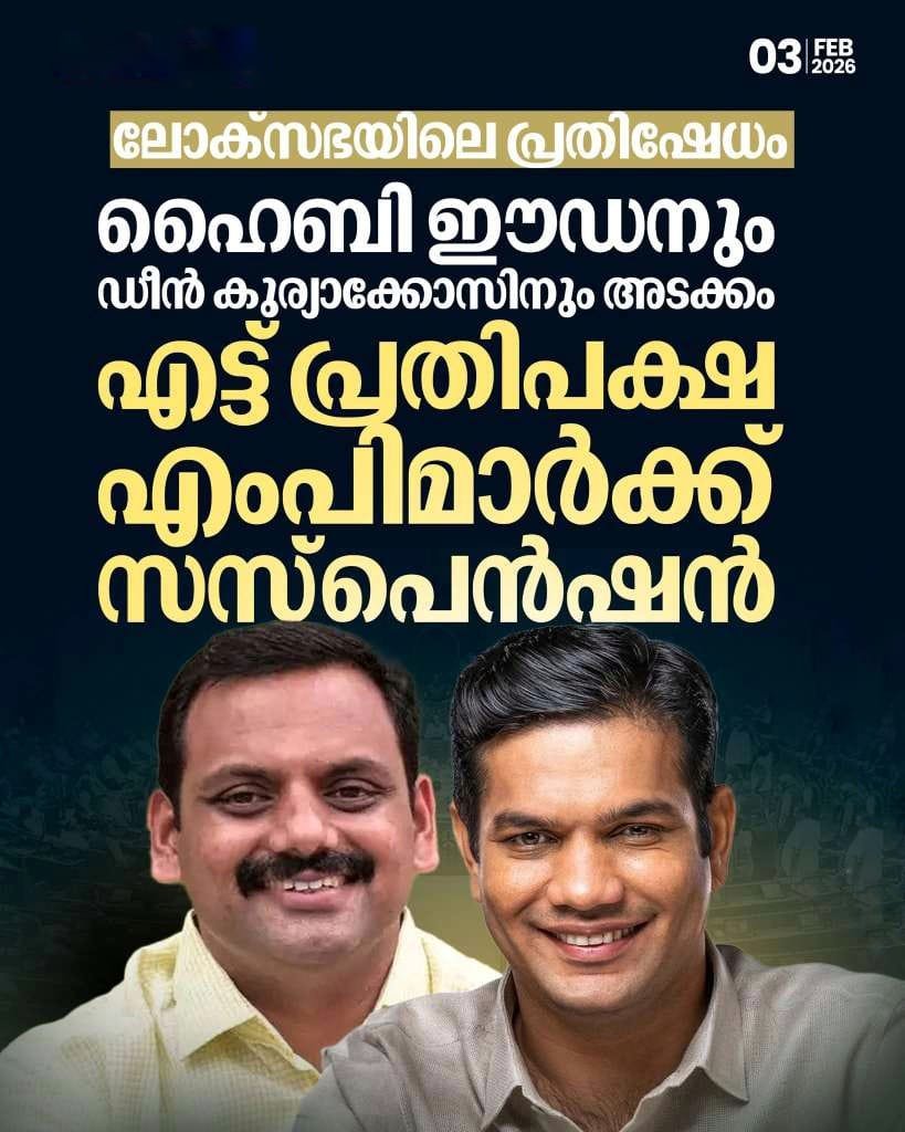 ലോക്സഭയിൽ സ്പീക്കറുടെ ഡയസിനു മുന്നിൽ പ്രതിഷേധിച്ച എട്ട് പ്രതിപക്ഷ എംപിമാരെ സസ്പെൻഡ് ചെയ്തു. കേരളത്തിൽ നിന്നുള്ള ഹൈബി ഈഡൻ, ഡീൻ കുര്യാക്കോസ് എന്നിവരുൾപ്പെടെയുള്ളവർക്കെതിരെയാണ് സ്പീക്കർ ഓം ബിർള നടപടി സ്വീകരിച്ചത്.