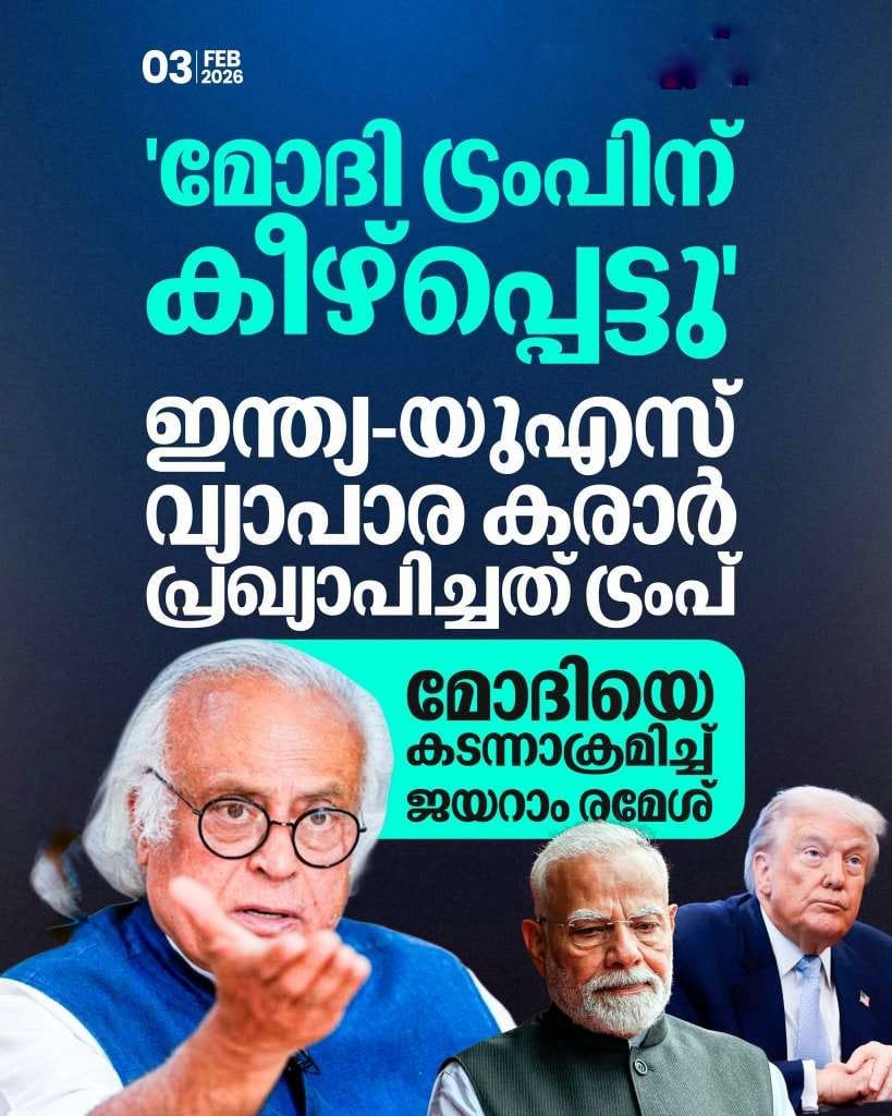 ഓപ്പറേഷൻ സിന്ദൂർ അവസാനിപ്പിച്ചത് മുതൽ റഷ്യൻ എണ്ണ ഇറക്കുമതിയിലെ നിയന്ത്രണങ്ങൾ വരെ ട്രംപ് വാഷിംഗ്ടണിൽ നിന്ന് പ്രഖ്യാപിക്കുന്നത് മോദി ഭരണകൂടത്തിന്റെ കീഴടങ്ങലാണെന്ന് അദ്ദേഹം ആരോപിച്ചു.പ്രധാനമന്ത്രി മോദിയുമായുള്ള ചർച്ചയ്ക്ക് പിന്നാലെ ഇന്ത്യ-യുഎസ് വ്യാപാര കരാർ ധാരണയായ വിവരം ഡോണൾഡ് ട്രംപ് ട്രൂത്ത് സോഷ്യലിലൂടെ പ്രഖ്യാപിച്ചു. ഇന്ത്യൻ ഉൽപ്പന്നങ്ങളുടെ നികുതി 25-ൽ നിന്ന് 18 ശതമാനമായി കുറയ്ക്കുമെന്നും റഷ്യൻ എണ്ണ ഒഴിവാക്കി ഇന്ത്യ വെനസ്വേലയിൽ നിന്ന് എണ്ണ വാങ്ങുമെന്നും അദ്ദേഹം വ്യക്തമാക്കി.