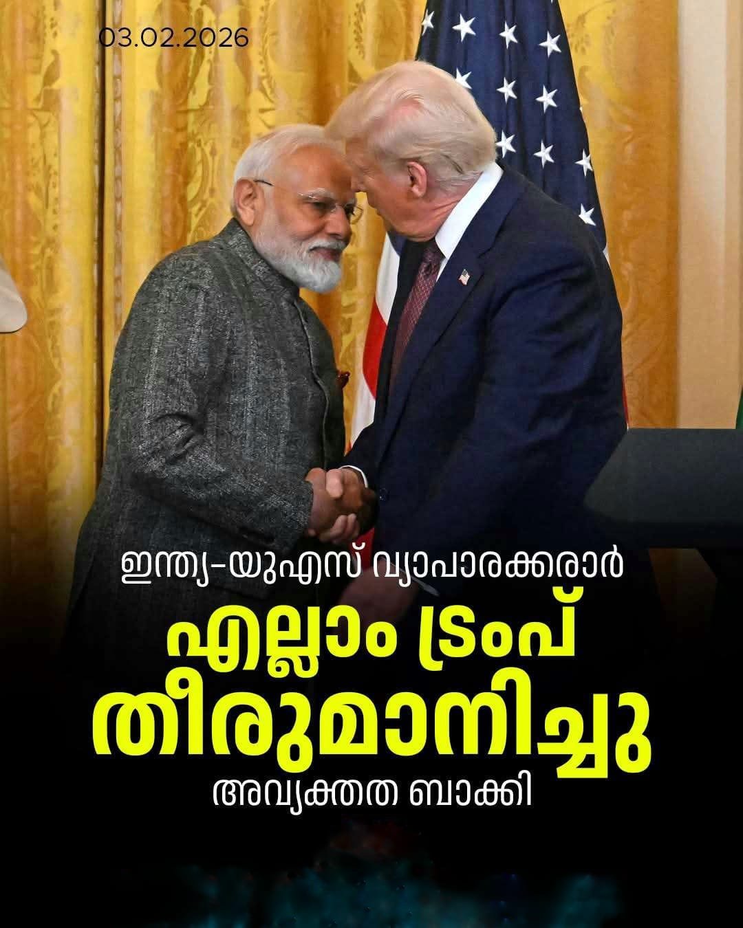 ഇതിന് തൊട്ടുപിന്നാലെയാണ് വ്യാപാരക്കരാർ പ്രഖ്യാപനം വന്നത്. മുൻപ് കശ്മീർ വിഷയത്തിലുൾപ്പെടെ ട്രംപ് നടത്തിയ അപ്രതീക്ഷിത പ്രസ്താവനകൾ ഇന്ത്യയെ പ്രതിസന്ധിയിലാക്കിയിരുന്ന ചരിത്രമുണ്ട്.ഇന്ത്യ–യൂറോപ്യൻ യൂണിയൻ കരാറിനും കേന്ദ്ര ബജറ്റിനും തൊട്ടുപിന്നാലെയാണ് യുഎസുമായുള്ള വ്യാപാര കരാർ ട്രംപ് പ്രഖ്യാപിച്ചത്. ‘ഫാദർ ഓഫ് ഓൾ ഡീൽസ്’ (Father of all deals) വരാനിരിക്കുന്നുവെന്ന് വാണിജ്യ മന്ത്രി പീയൂഷ് ഗോയൽ നേരത്തെ സൂചിപ്പിച്ചിരുന്നു. ട്രംപിന്റെ പ്രഖ്യാപനം വന്നിട്ടും ഇന്ത്യ ഔദ്യോഗിക സ്ഥിരീകരണം നൽകാൻ വൈകുന്നത് ശ്രദ്ധേയമാണ്.