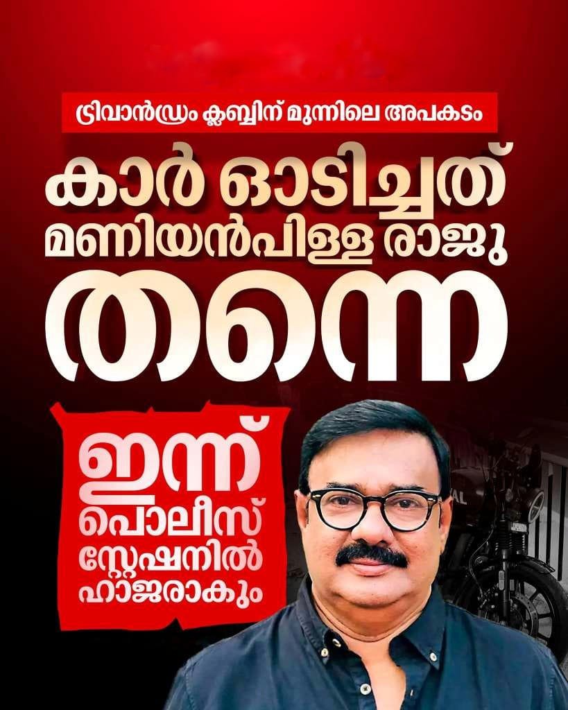 ഇന്ന് അപകടമുണ്ടാക്കിയ കാറുമായി അദ്ദേഹം മ്യൂസിയം സ്റ്റേഷനിൽ ഹാജരായേക്കുമെന്ന് പോലീസിനെ അറിയിച്ചിട്ടുണ്ട്.ട്രിവാൻഡ്രം ക്ലബിന് മുന്നിൽ വോൾവോ കാറിടിച്ച് ബൈക്ക് യാത്രക്കാരായ നിദേവിനും സൂരജിനും പരിക്കേറ്റു.