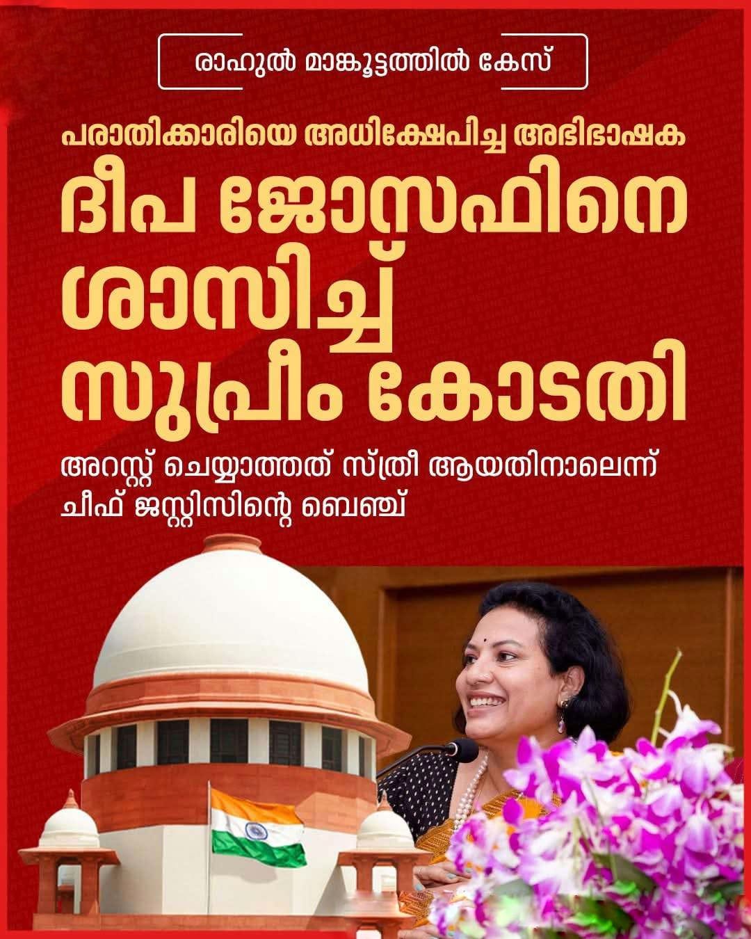 സ്ത്രീയെന്ന പരിഗണന കൊണ്ടാണ് അറസ്റ്റിന് ഉത്തരവിടാത്തതെന്നും പുരുഷനായിരുന്നെങ്കിൽ നടപടി മറ്റൊന്നാകുമായിരുന്നു എന്നും സുപ്രീംകോടതി ദീപ ജോസഫിനെ ഓർമ്മിപ്പിച്ചു.