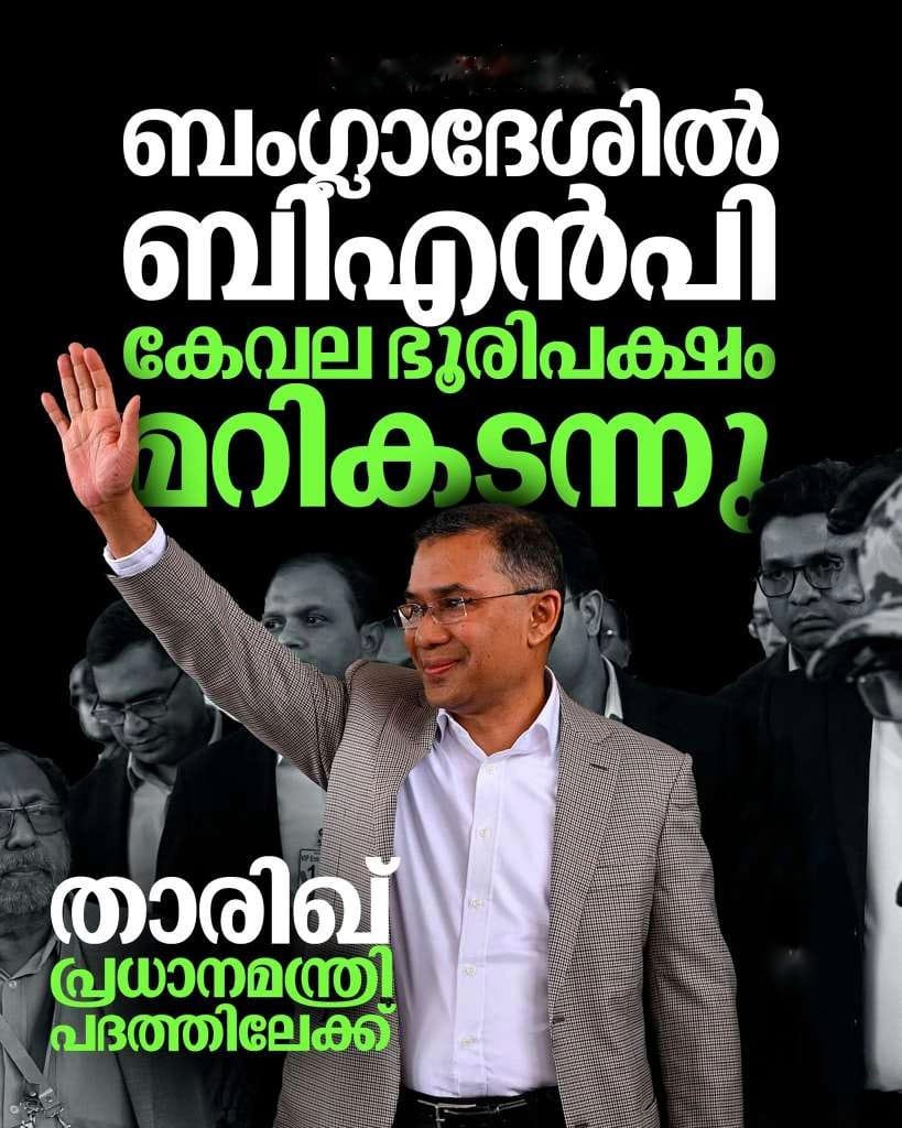 ഒന്നര പതിറ്റാണ്ടിന് ശേഷം ബംഗ്ലാദേശിൽ ബി.എൻ.പി (BNP) അധികാരത്തിലേക്ക്. താരിഖ് റഹ്മാന്റെ നേതൃത്വത്തിലുള്ള പാർട്ടി കേവല ഭൂരിപക്ഷത്തിന് ആവശ്യമായ 151 സീറ്റുകൾ മറികടന്നു. അതേസമയം, പ്രധാന എതിരാളികളായ ജമാഅത്തെ ഇസ്ലാമിക്ക് കനത്ത തിരിച്ചടി നേരിട്ടു; അവർക്ക് കേവലം 34 സീറ്റുകൾ മാത്രമാണ് ലഭിച്ചത്.താരിഖ് പ്രധാനമന്ത്രിപദത്തിലേക്ക് വരുമെന്നാണ് സൂചനകൾ. കൂടുതൽ സുരക്ഷിതവും സ്വതന്ത്രവുമായ ബംഗ്ലാദേശാണ് താരിഖ് വാദ്ഗാനം ചെയ്തിരിക്കുന്നത്.