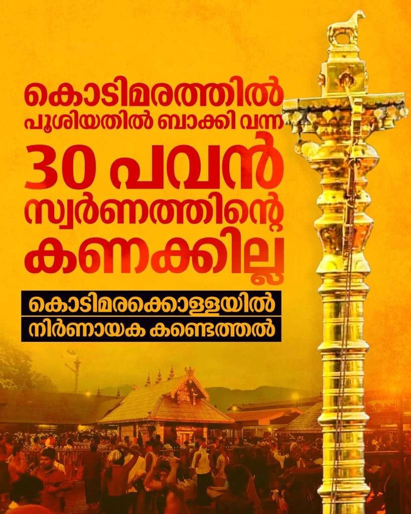 ശബരിമല കൊടിമര പുനഃപ്രതിഷ്ഠയ്ക്ക് ശേഷം ബാക്കി വന്ന 30 പവൻ സ്വർണത്തിന്റെ കണക്കുകൾ കാണാനില്ലെന്ന് വിജിലൻസ് കണ്ടെത്തി. ആകെ ഉണ്ടായിരുന്ന 9.570 കിലോ സ്വർണത്തിൽ 9.340 കിലോ മാത്രമാണ് ഉപയോഗിച്ചത്. മിച്ചം വന്ന സ്വർണം എവിടെ പോയി എന്നതിൽ ദേവസ്വം ബോർഡിന് വ്യക്തതയില്ലാത്തത് വൻ വെട്ടിപ്പ് നടന്നെന്ന സംശയം ബലപ്പെടുത്തുന്നു.