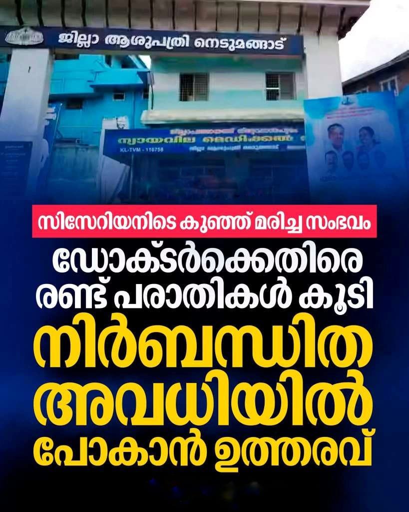 നെടുമങ്ങാട് ജില്ലാ ആശുപത്രിയിൽ സിസേറിയനിടെ കുഞ്ഞ് മരിച്ച സംഭവത്തിൽ ഡോ. ബിന്ദു സുന്ദറിനോട് നിർബന്ധിത അവധിയിൽ പ്രവേശിക്കാൻ ആരോഗ്യവകുപ്പ് ഉത്തരവിട്ടു. മന്ത്രി വീണ ജോർജിന്റെ നിർദേശപ്രകാരം അന്വേഷണവിധേയമായാണ് നടപടി.