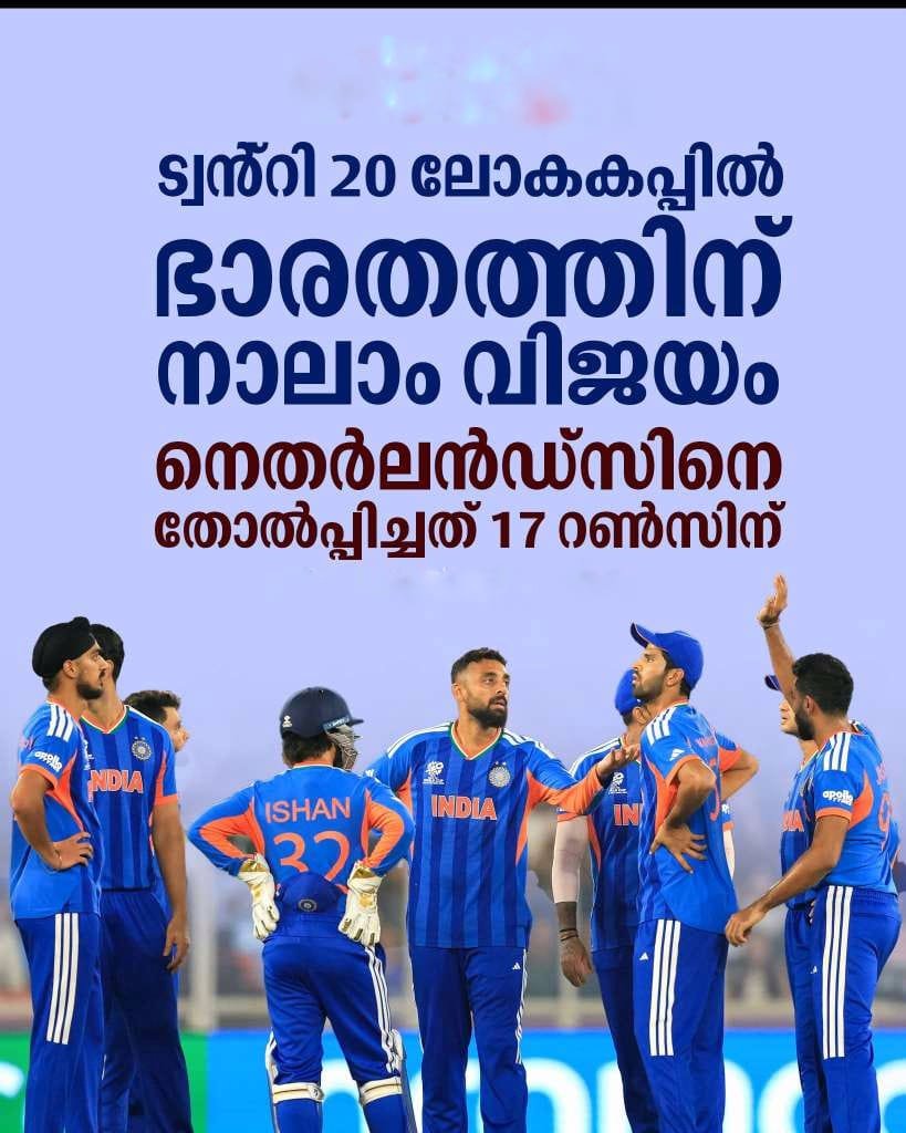 ടി20 ലോകകപ്പിൽ നെതർലൻഡ്സിനെതിരെ ഇന്ത്യ 193 റൺസ് നേടി. അഹമ്മദാബാദിൽ ടോസ് നേടി ആദ്യം ബാറ്റിങ്ങിനിറങ്ങിയ ഇന്ത്യ 6 വിക്കറ്റ് നഷ്ടത്തിലാണ് ഈ മികച്ച സ്കോർ ഉയർത്തിയത്. 31 പന്തിൽ 66 റൺസെടുത്ത ശിവം ദുബെയുടെ വെടിക്കെട്ട് ബാറ്റിങ്ങാണ് ഇന്ത്യയെ ശക്തമായ നിലയിലെത്തിച്ചത്.
