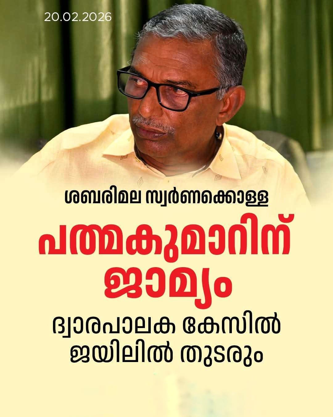 ശബരിമല കട്ടിളപ്പാളി കടത്തുകേസിൽ മുൻ ദേവസ്വം ബോർഡ് പ്രസിഡന്റ് എ. പത്മകുമാറിന് കൊല്ലം വിജിലൻസ് കോടതി ജാമ്യം അനുവദിച്ചു. എന്നാൽ, ദ്വാരപാലക ശില്പങ്ങളിലെ സ്വർണപ്പാളികൾ കടത്തിയ കേസിൽ ജാമ്യം ലഭിക്കാത്തതിനാൽ അദ്ദേഹത്തിന് ജയിൽ മോചിതനാകാൻ കഴിയില്ല.ശബരിമല കട്ടിളപ്പാളി കേസിൽ എട്ടാം പ്രതിയായ എ. പത്മകുമാർ 2025 നവംബർ 20-നാണ് അറസ്റ്റിലായത്.