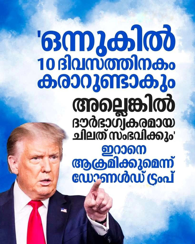 അടുത്ത പത്ത് ദിവസത്തിനുള്ളിൽ പുതിയ ആണവ കരാറിൽ ഒപ്പിട്ടില്ലെങ്കിൽ ഇറാനെതിരെ ശക്തമായ സൈനിക നടപടി ഉണ്ടാകുമെന്ന് യുഎസ് പ്രസിഡന്റ് ഡൊണാൾഡ് ട്രംപ് മുന്നറിയിപ്പ് നൽകി. “ഒന്നുകിൽ പത്ത് ദിവസത്തിനകം കരാർ ഉണ്ടാകും, അല്ലെങ്കിൽ നിർഭാഗ്യകരമായ ചിലത് സംഭവിക്കും” എന്നായിരുന്നു ട്രംപിന്റെ വാക്കുകൾ.