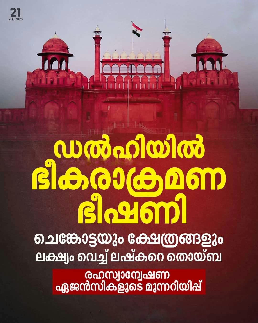 പാകിസ്താൻ കേന്ദ്രമായുള്ള ഭീകരസംഘടനയുടെ നീക്കം തടയാൻ തലസ്ഥാന നഗരിയിൽ സുരക്ഷാ പരിശോധനകൾ കർശനമാക്കി.ചാന്ദ്നി ചൗക്കിലെ ക്ഷേത്രങ്ങളെയും ചെങ്കോട്ടയെയും ലക്ഷ്യമിട്ട് ലഷ്കറെ തൊയ്ബ ഐഇഡി (IED) സ്ഫോടനത്തിന് പദ്ധതിയിടുന്നതായി രഹസ്യാന്വേഷണ ഏജൻസികൾ മുന്നറിയിപ്പ് നൽകി.