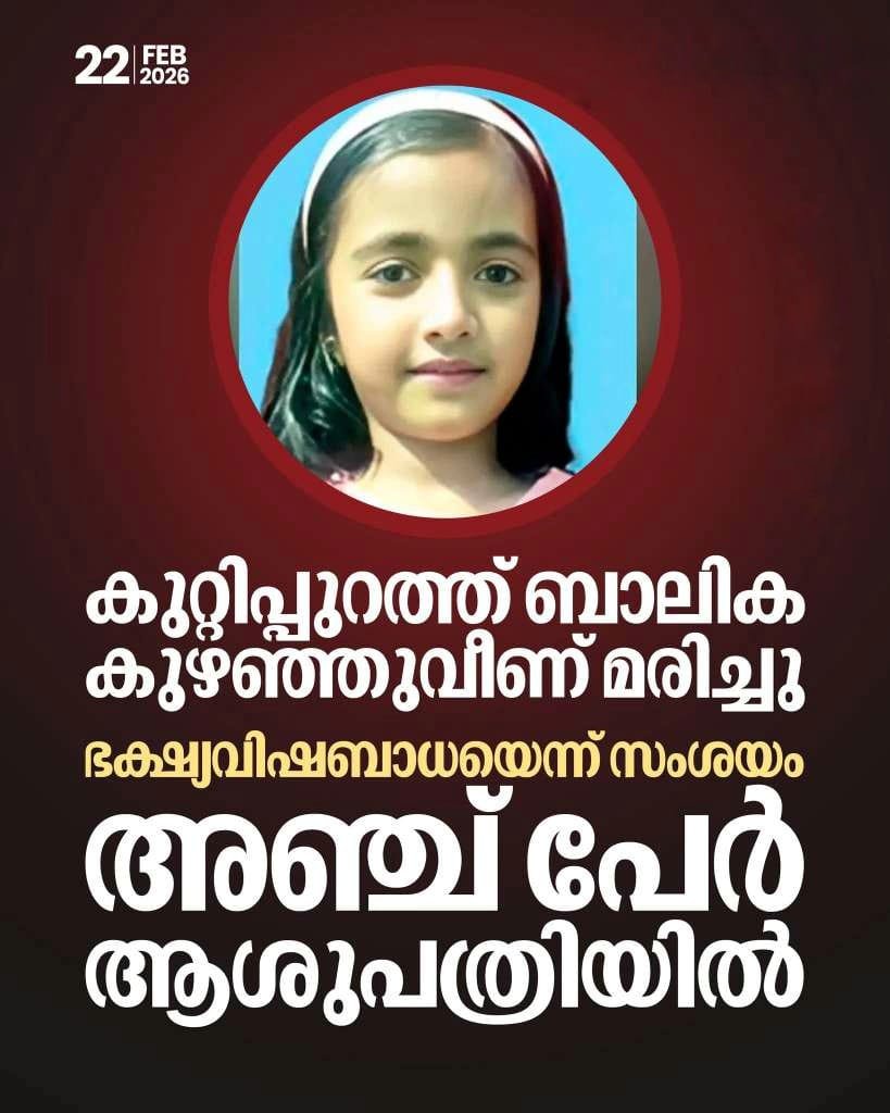 മലപ്പുറം കുറ്റിപ്പുറത്ത് വയറിളക്കവും ഛർദ്ദിയും ബാധിച്ച് ഏഴ് വയസ്സുകാരി ലസ്ന മരിച്ചു. കുട്ടിയുടെ മാതാപിതാക്കളും ബന്ധുക്കളും ഉൾപ്പെടെ അഞ്ച് പേർ സമാനമായ ലക്ഷണങ്ങളോടെ ചികിത്സയിലാണ്. ഭക്ഷ്യവിഷബാധയാണോ മരണകാരണമെന്ന് പോലീസ് പരിശോധിച്ചുവരുന്നു.