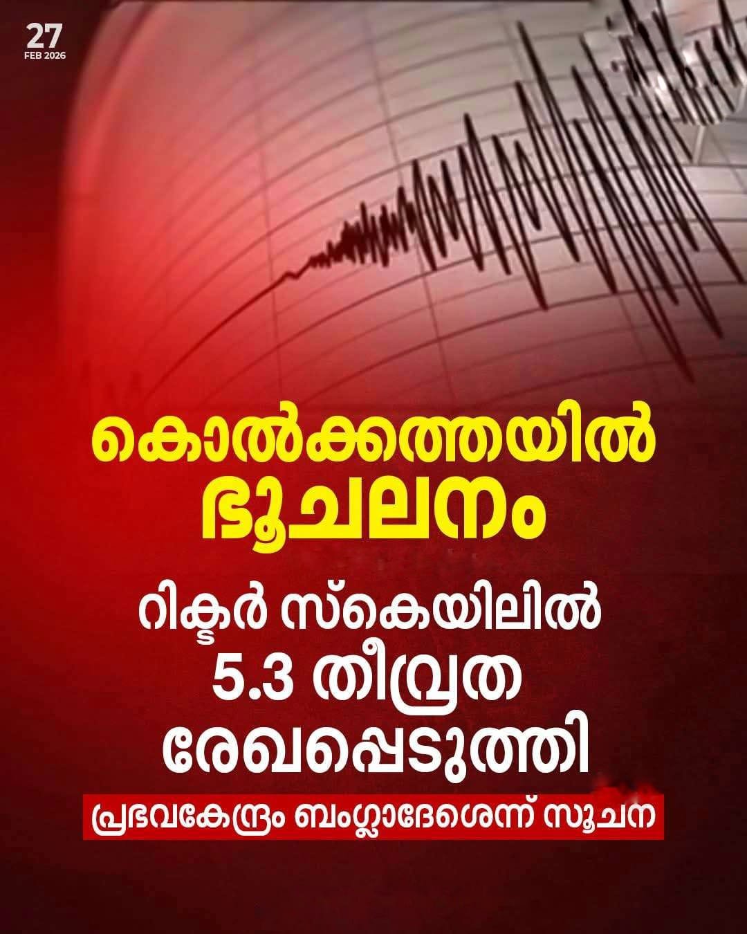 വെള്ളിയാഴ്ച ഉച്ചയോടെ കൊൽക്കത്തയിലും പരിസരപ്രദേശങ്ങളിലും റിക്ടർ സ്കെയിലിൽ 4.9 തീവ്രത രേഖപ്പെടുത്തിയ ഭൂചലനം അനുഭവപ്പെട്ടു. ഏതാനും സെക്കൻഡുകൾ നീണ്ടുനിന്ന പ്രകമ്പനത്തെത്തുടർന്ന് ആളുകൾ കെട്ടിടങ്ങളിൽ നിന്ന് പരിഭ്രാന്തരായി പുറത്തേക്കോടി. ബംഗ്ലാദേശാണ് ഭൂചലനത്തിന്റെ പ്രഭവകേന്ദ്രമെന്നാണ് പ്രാഥമിക റിപ്പോർട്ടുകൾ സൂചിപ്പിക്കുന്നത്.