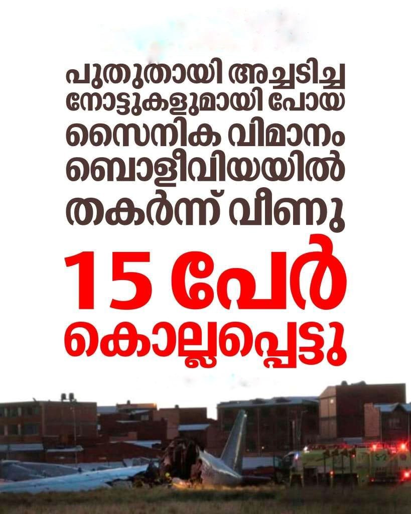 ബൊളീവിയൻ തലസ്ഥാനമായ ലാ പാസിന് സമീപം പുതുതായി അച്ചടിച്ച നോട്ടുകളുമായി പോയ സൈനിക വിമാനം തകർന്ന് 15 പേർ കൊല്ലപ്പെട്ടു. നിയന്ത്രണം വിട്ട വിമാനം ഹൈവേയിലെ വാഹനങ്ങൾക്ക് മുകളിലേക്ക് വീണതോടെ നോട്ടുകൾ റോഡിൽ ചിതറി. വെള്ളിയാഴ്ചയായിരുന്നു നാടിനെ നടുക്കിയ ഈ ദാരുണ അപകടം നടന്നത്.