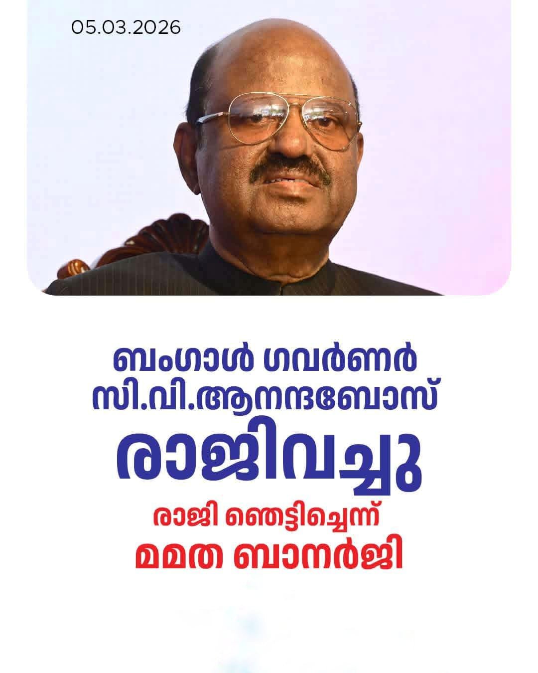 ബംഗാൾ ഗവർണർ സി.വി. ആനന്ദബോസ് അപ്രതീക്ഷിതമായി രാജിവച്ചു. മൂന്നര വർഷത്തെ സേവനത്തിന് ശേഷമുള്ള ഈ നീക്കത്തിന്റെ കാരണം വ്യക്തമല്ല. പുതിയ ഗവർണറായി ആർ.എൻ. രവിയെ നിയമിച്ചേക്കുമെന്നാണ് സൂചന.