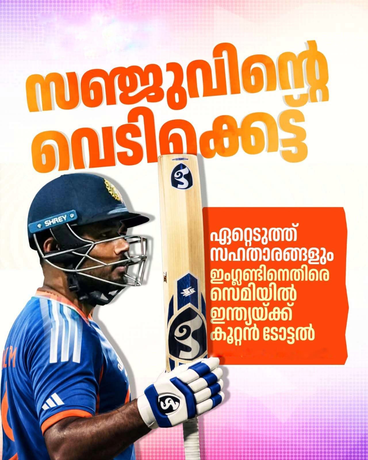 ടി20 ലോകകപ്പ് സെമിയിൽ സഞ്ജു സാംസണിന്റെയും സഹതാരങ്ങളുടെയും വെടിക്കെട്ട് ബാറ്റിംഗിൽ ഇംഗ്ലണ്ടിന് കൂറ്റൻ ലക്ഷ്യം. 42 പന്തിൽ 89 റൺസെടുത്ത സഞ്ജുവിനൊപ്പം ഇഷാൻ കിഷൻ (39), ശിവം ദുബെ (43) എന്നിവരും തിളങ്ങിയതോടെ ഇന്ത്യ 20 ഓവറിൽ 7 വിക്കറ്റിന് 253 റൺസടിച്ചു.