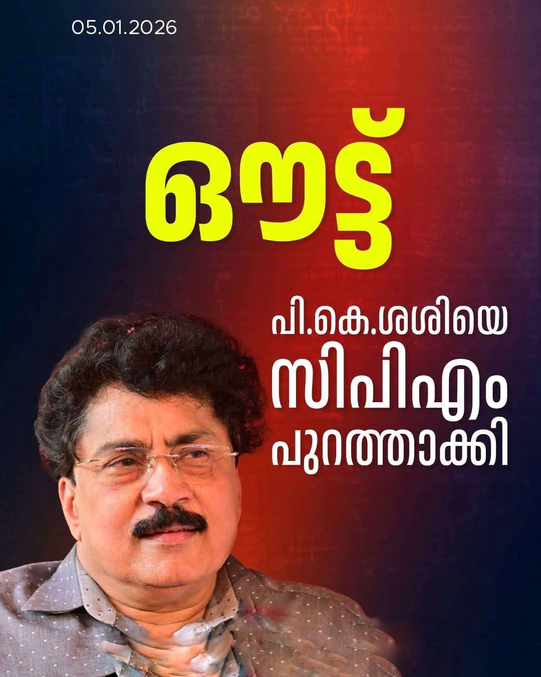 സി.പി.ഐ.എം സംസ്ഥാന-ജില്ലാ നേതൃത്വങ്ങൾക്കെതിരെ രൂക്ഷവിമർശനം ഉന്നയിച്ചതിന് പിന്നാലെ പി.കെ. ശശിയെ പാർട്ടിയിൽ നിന്ന് പുറത്താക്കി. പ്രാഥമിക അംഗത്വത്തിൽ നിന്നാണ് അദ്ദേഹത്തെ നീക്കിയത്.