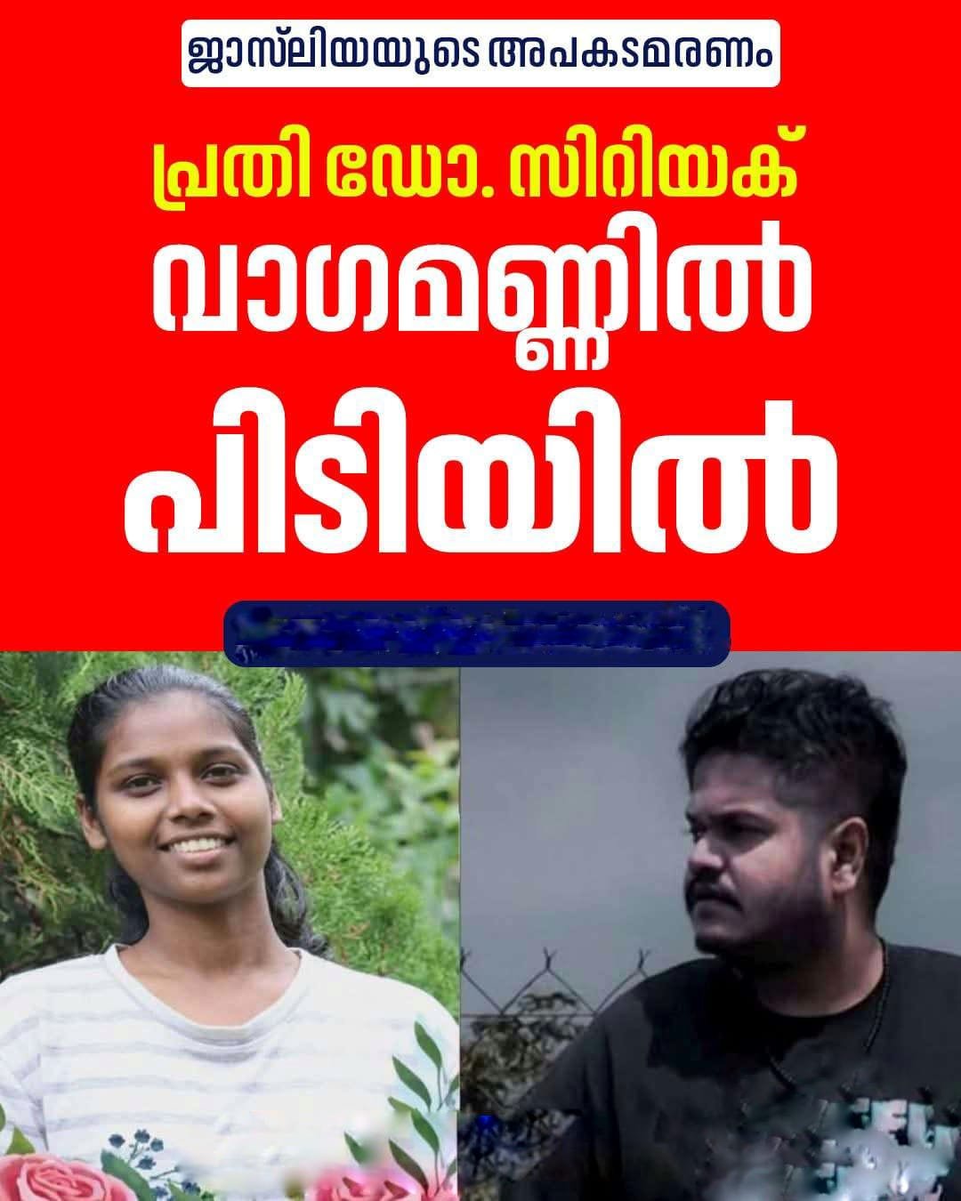 അങ്കമാലിയിൽ വിദ്യാർത്ഥിനി ജസ്‌ലിയയുടെ മരണത്തിനിടയാക്കിയ അപകടത്തിലെ പ്രതി ഡോ. സിറിയക് പി. ജോർജിനെ വാഗമൺ പോലീസ് കസ്റ്റഡിയിലെടുത്തു. ഒളിവിൽ കഴിഞ്ഞിരുന്ന പ്രതിയെ ഉടൻ അങ്കമാലി പോലീസിന് കൈമാറും.