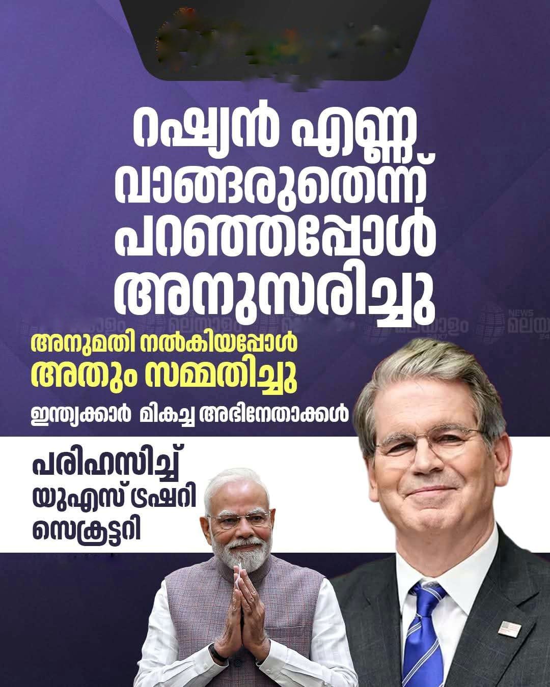 നിലവിൽ കടലിൽ കുടുങ്ങിയ കപ്പലുകളിലെ എണ്ണ വാങ്ങാൻ മാത്രമാണ് ഇന്ത്യക്ക് താൽക്കാലിക അനുമതി നൽകിയിട്ടുള്ളതെന്നും യുഎസ് വ്യക്തമാക്കി.റഷ്യൻ എണ്ണ വാങ്ങുന്ന കാര്യത്തിൽ ഇന്ത്യയുടെ നിലപാടിനെ പരിഹസിച്ച് യുഎസ് ട്രഷറി സെക്രട്ടറി സ്കോട്ട് ബെസെന്റ്.