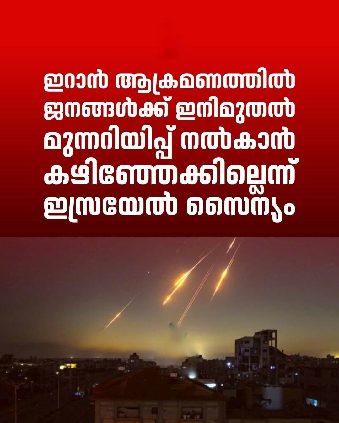 ഇറാൻ മിസൈൽ ആക്രമണങ്ങളിൽ ജനങ്ങൾക്ക് മുൻകൂട്ടി മുന്നറിയിപ്പ് നൽകുന്നതിൽ ഇനി ഉറപ്പ് നൽകാനാവില്ലെന്ന് ഇസ്രയേൽ സൈന്യം (IDF) അറിയിച്ചു. സാങ്കേതികവും പ്രവർത്തനപരവുമായ വെല്ലുവിളികൾ കാരണം സൈറണുകൾക്ക് മുമ്പ് മൊബൈൽ ഫോണുകളിൽ അലേർട്ടുകൾ നൽകുന്നത് പ്രായോഗികമല്ലെന്നാണ് ഐഡിഎഫ് വ്യക്തമാക്കിയത്.