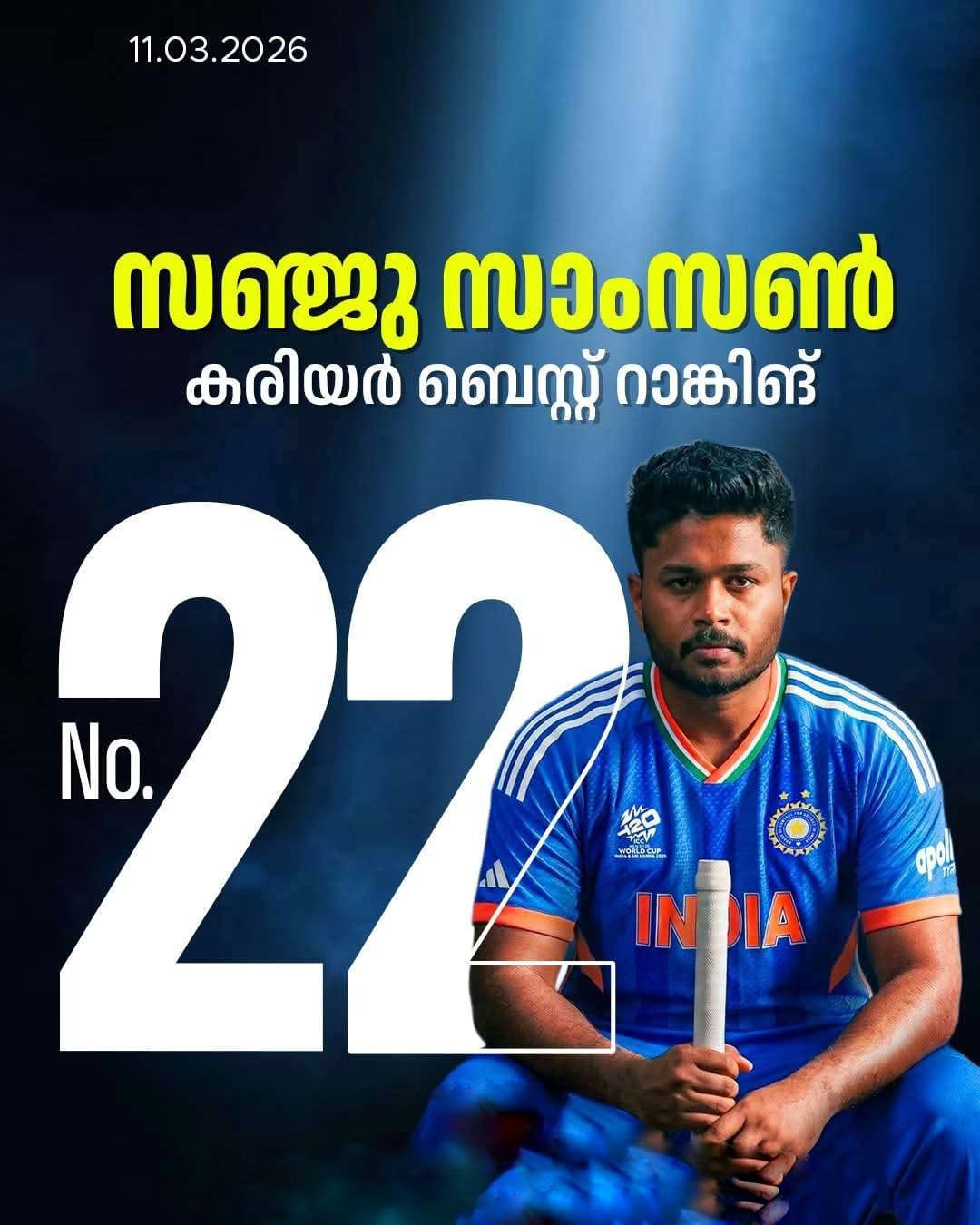ലോകകപ്പിന് മുൻപ് 65-ാം സ്ഥാനത്തേക്ക് പിന്തള്ളപ്പെട്ടിരുന്ന താരം, പ്ലെയർ ഓഫ് ദി ടൂർണമെന്റ് പട്ടം ചൂടിയ കരുത്തിലാണ് ഈ ഉജ്ജ്വല തിരിച്ചുവരവ് നടത്തിയത്.സെമിയിലും ഫൈനലിലും നടത്തിയ മിന്നും പ്രകടനത്തോടെ ആകെ 43 സ്ഥാനങ്ങൾ മെച്ചപ്പെടുത്തിയാണ് സഞ്ജു സാംസൺ തന്റെ കരിയറിലെ ഏറ്റവും മികച്ച റാങ്കായ 22-ൽ എത്തിയത്.