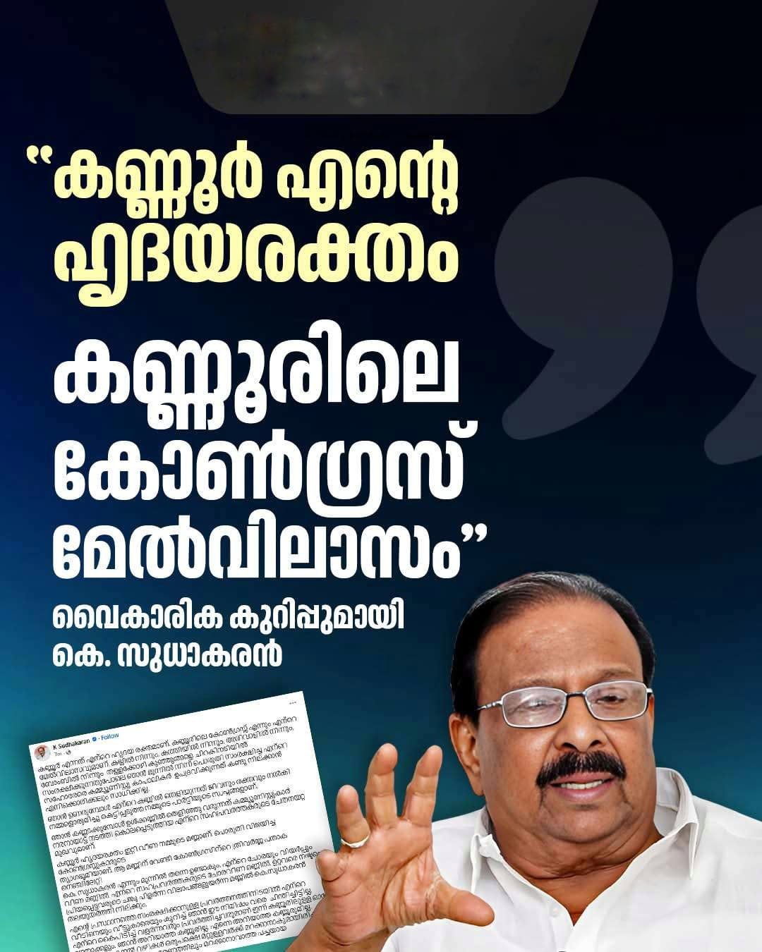കണ്ണൂർ തന്റെ ഹൃദയരക്തമാണെന്നും അവിടുത്തെ കോൺഗ്രസാണ് തന്റെ മേൽവിലാസമെന്നും കെ. സുധാകരൻ വൈകാരികമായി കുറിച്ചു. കണ്ണൂരിന് വേണ്ടി കോൺഗ്രസ് പതാകയേന്തി എന്നും താൻ മുന്നിലുണ്ടാകുമെന്നും അദ്ദേഹം ഫേസ്ബുക്ക് കുറിപ്പിലൂടെ വ്യക്തമാക്കി.