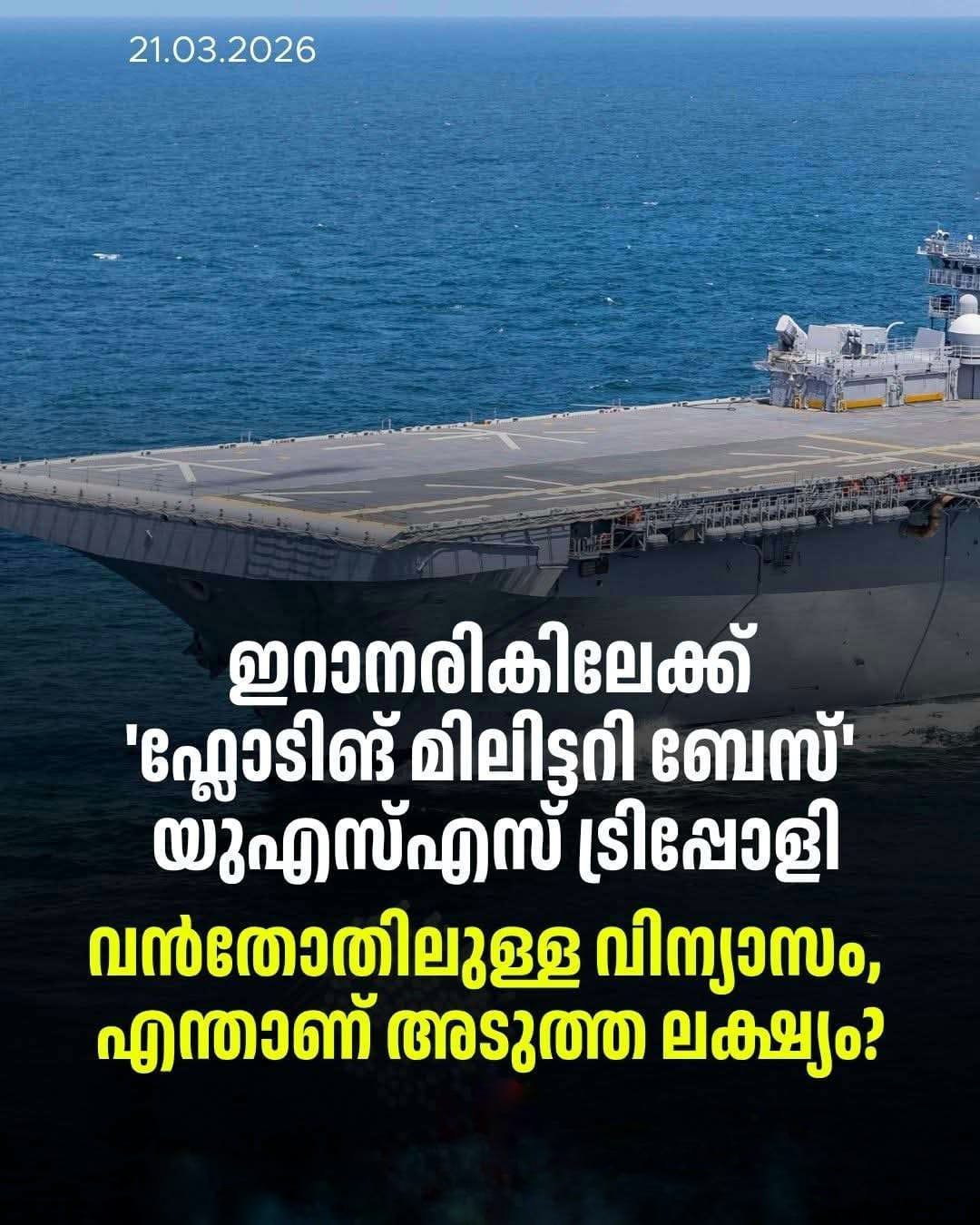 അത്യന്താധുനിക യുദ്ധക്കപ്പലായ യുഎസ്എസ് ട്രിപ്പോളിയെ പേർഷ്യൻ ഗൾഫിലേക്ക് വിന്യസിക്കാനുള്ള അമേരിക്കയുടെ തീരുമാനം വലിയ ചർച്ചകൾക്ക് വഴിതുറന്നിരിക്കുകയാണ്. ഇത് ഇറാനുമായുള്ള ഒരു കരയുദ്ധത്തിനുള്ള മുന്നൊരുക്കമാണോ എന്ന സംശയം ഉയരുന്നുണ്ടെങ്കിലും, മിഡിൽ ഈസ്റ്റിലേക്ക് കരസേനയെ അയക്കുമെന്ന വാർത്തകളെ ട്രംപ് നിഷേധിച്ചു.