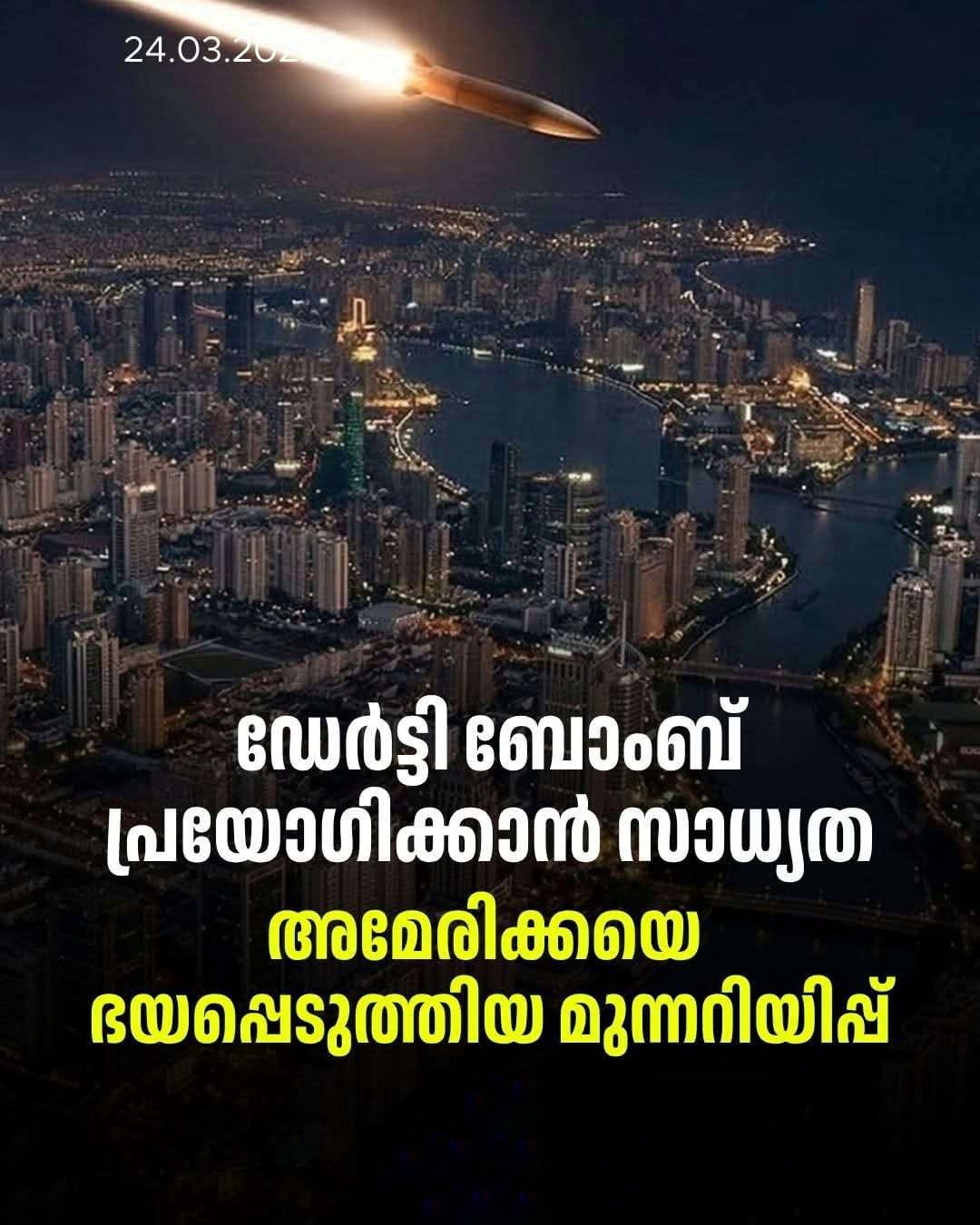 പശ്ചിമേഷ്യൻ യുദ്ധത്തിനിടെ ഇറാൻ ‘ഡേർട്ടി ബോംബ്’ പ്രയോഗിച്ചേക്കുമെന്ന ഇന്റലിജൻസ് റിപ്പോർട്ട് അമേരിക്കയെ ആശങ്കയിലാക്കുന്നു. ഡൈനാമിറ്റ് പോലുള്ള സാധാരണ സ്ഫോടകവസ്തുക്കളിൽ റേഡിയോ ആക്ടീവ് പദാർത്ഥങ്ങൾ കലർത്തിയാണ് ഇവ നിർമ്മിക്കുന്നത്.