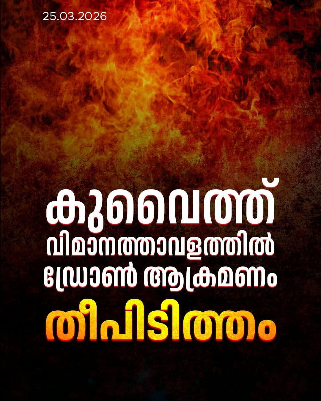 കുവൈത്ത് രാജ്യാന്തര വിമാനത്താവളത്തിലെ ഇന്ധന ടാങ്കിന് നേരെ ഇറാന്റെ ഡ്രോൺ ആക്രമണമുണ്ടായി. അഗ്നിശമന സേനാംഗങ്ങൾ ഉടൻ തന്നെ തീ നിയന്ത്രണവിധേയമാക്കിയതിനാൽ വൻ അപകടം ഒഴിവായി; ആളപായമില്ലെന്ന് സിവിൽ ഏവിയേഷൻ അതോറിറ്റി അറിയിച്ചു.