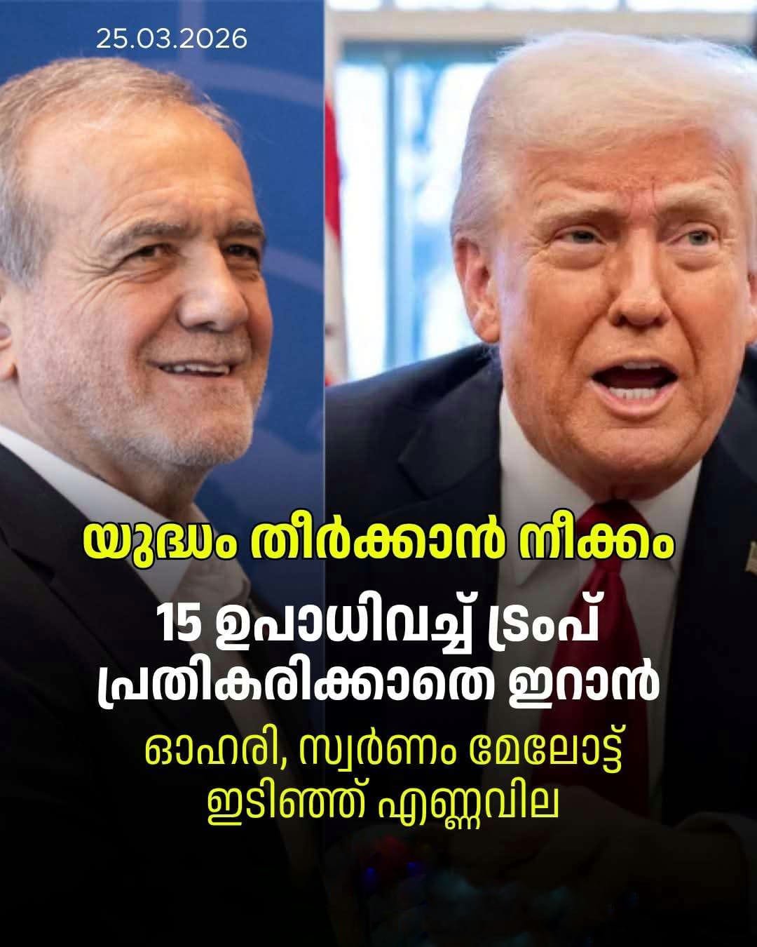 ഇരുരാജ്യങ്ങളും തമ്മിലുള്ള ഈ നയതന്ത്ര പോരാട്ടംപശ്ചിമേഷ്യയിലെ സമാധാനശ്രമങ്ങളെ കൂടുതൽ സങ്കീർണ്ണമാക്കുന്നു.എണ്ണവിലയും ഓഹരിയും: യുദ്ധഭീതി ഒഴിഞ്ഞതോടെ ക്രൂഡ് ഓയിൽ വില കുത്തനെ ഇടിഞ്ഞു. ഇത് ആഗോള ഓഹരി വിപണികൾക്ക് കരുത്തേകി; ഇന്ത്യൻ വിപണിയിൽ ഗിഫ്റ്റ് നിഫ്റ്റി 200 പോയിന്റിലധികം മുന്നേറി.
