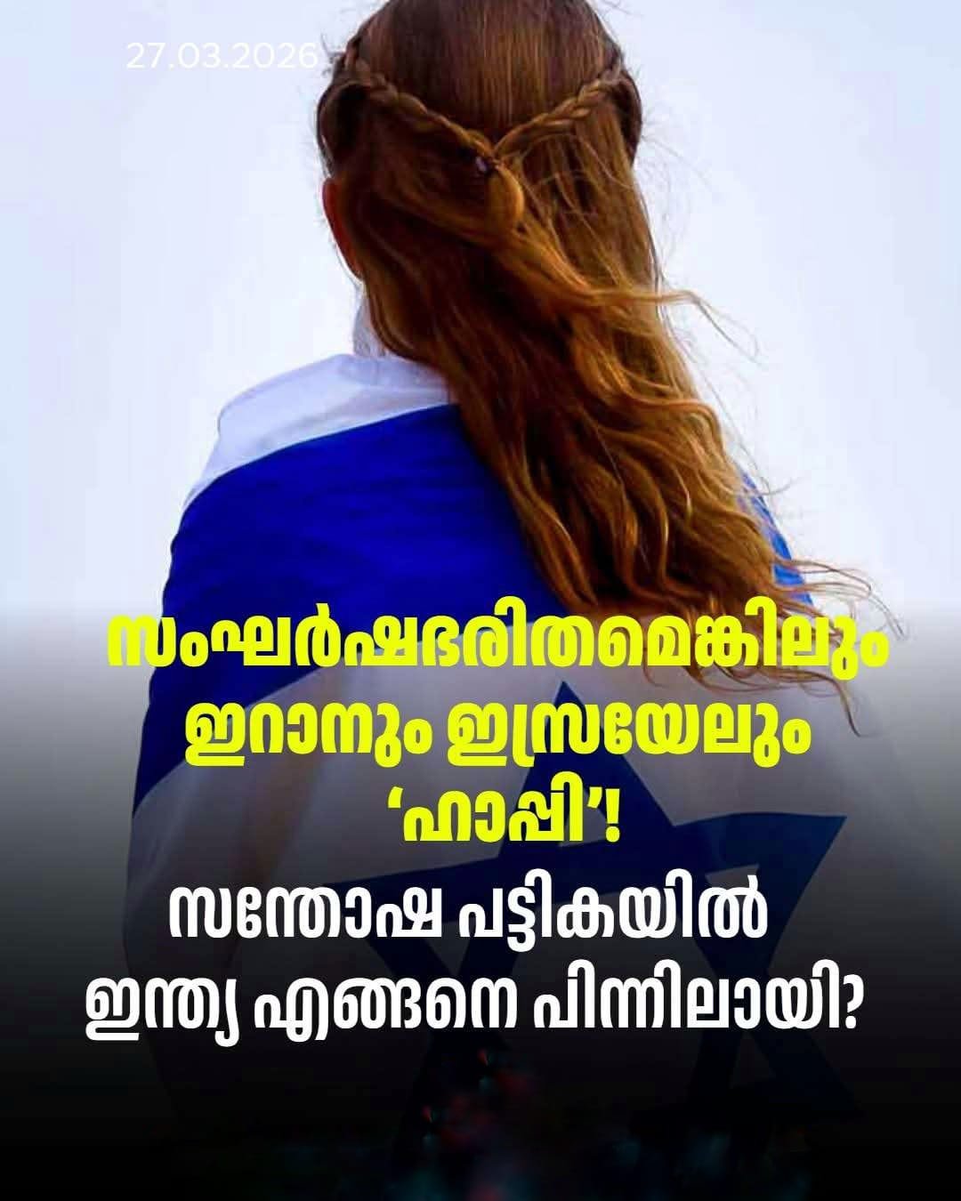 2026-ലെ വേൾഡ് ഹാപ്പിനസ് റിപ്പോർട്ടിൽ ഇന്ത്യ 116-ാം സ്ഥാനത്താണ്. യുദ്ധവും ആഭ്യന്തര പ്രശ്നങ്ങളും നിലനിൽക്കുന്ന ഇസ്രയേൽ (8-ാം സ്ഥാനം), ഇറാൻ (97-ാം സ്ഥാനം) തുടങ്ങിയ രാജ്യങ്ങൾ ഇന്ത്യയേക്കാൾ മുന്നിലെത്താൻ പ്രധാനമായും ആറ് കാരണങ്ങളാണുള്ളത്: