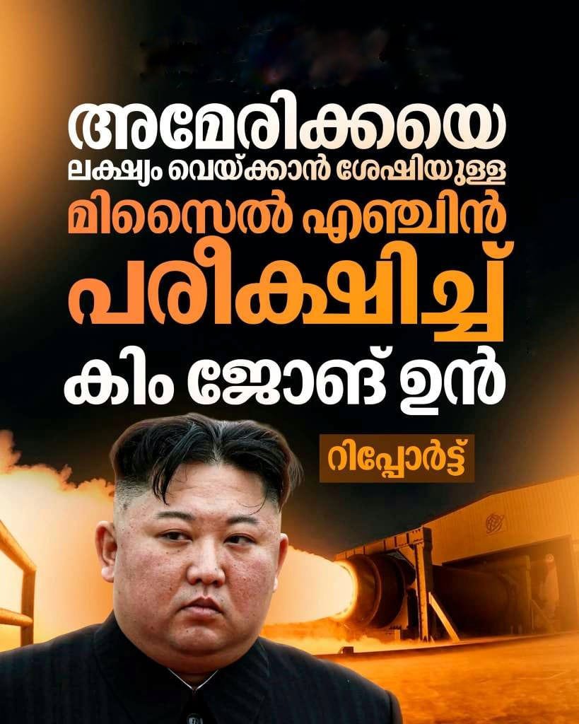 അമേരിക്കയെ ലക്ഷ്യമിടാൻ ശേഷിയുള്ള പുതിയ ഹൈ-ത്രസ്റ്റ് സോളിഡ്-ഫ്യൂവൽ (solid-fuel) മിസൈൽ എൻജിൻ കിം ജോങ് ഉൻ വിജയകരമായി പരീക്ഷിച്ചു. രാജ്യത്തിന്റെ സൈനിക ശക്തി വർധിപ്പിക്കുന്നതിൽ ഇത് നിർണ്ണായകമാണെന്ന് അദ്ദേഹം അവകാശപ്പെട്ടു.