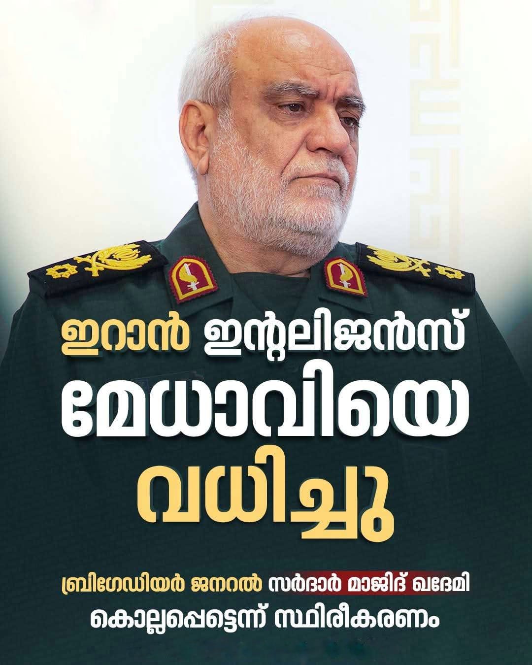 ഇറാൻ റെവല്യൂഷണറി ഗാർഡ് കോർപ്സിന്റെ (IRGC) ഇന്റലിജൻസ് വിഭാഗം മേധാവി ബ്രിഗേഡിയർ ജനറൽ സർദാർ മാജിദ് ഖദേമി കൊല്ലപ്പെട്ടു. തിങ്കളാഴ്ച (ഏപ്രിൽ 6) പുലർച്ചെയുണ്ടായ വ്യോമാക്രമണത്തിലാണ് അദ്ദേഹം കൊല്ലപ്പെട്ടതെന്ന് ഐആർജിസി സ്ഥിരീകരിച്ചു.