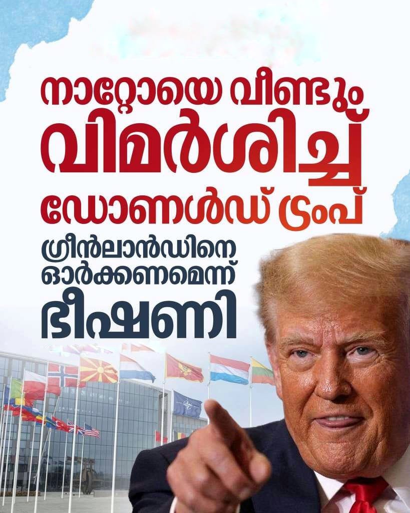 പശ്ചിമേഷ്യൻ സംഘർഷത്തിൽ പിന്തുണ നൽകാത്തതിൽ പ്രതിഷേധിച്ച് നാറ്റോയ്ക്കെതിരെ ഡോണൾഡ് ട്രംപ് വീണ്ടും രംഗത്തെത്തി. അമേരിക്ക നൽകുന്ന വലിയ സംഭാവനകൾക്ക് അർഹമായ പരിഗണന ലഭിക്കുന്നില്ലെന്ന് കുറ്റപ്പെടുത്തിയ ട്രംപ്, ഇത്തവണ ഗ്രീൻലാൻഡിനെ മുൻനിർത്തിയാണ് സഖ്യത്തെ ഭീഷണിപ്പെടുത്തിയത്.