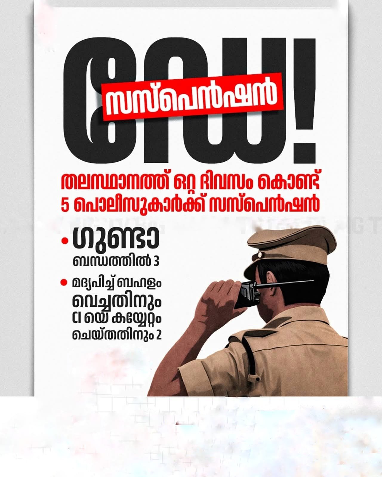 തിരുവനന്തപുരം സിറ്റിയിൽ അച്ചടക്ക ലംഘനത്തെത്തുടർന്ന് അഞ്ച് പൊലീസുകാരെ സസ്പെൻഡ് ചെയ്തു. മുതിർന്ന ഉദ്യോഗസ്ഥനെ മർദിച്ച സബ് ഇൻസ്പെക്ടർ, മദ്യപിച്ച് ഡ്യൂട്ടിക്ക് എത്തിയ ഉദ്യോഗസ്ഥൻ, ജയിലിലുള്ള ഗുണ്ടാ നേതാവിനെ സഹായിച്ച സിവിൽ പൊലീസ് ഓഫീസർ എന്നിവർക്കെതിരെയാണ് സിറ്റി പൊലീസ് കമ്മിഷണറുടെ നടപടി.