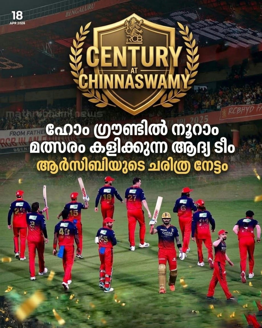 ഐപിഎൽ ചരിത്രത്തിൽ ഒരു നാഴികക്കല്ല് കൂടി പിന്നിടാൻ റോയൽ ചലഞ്ചേഴ്സ് ബെംഗളൂരു തയ്യാറെടുക്കുന്നു. സ്വന്തം തട്ടകമായ ചിന്നസ്വാമി സ്റ്റേഡിയത്തിൽ നൂറാം മത്സരം കളിക്കുന്ന ആദ്യ ടീം എന്ന റെക്കോർഡാണ് ആർസിബി സ്വന്തമാക്കുന്നത്.