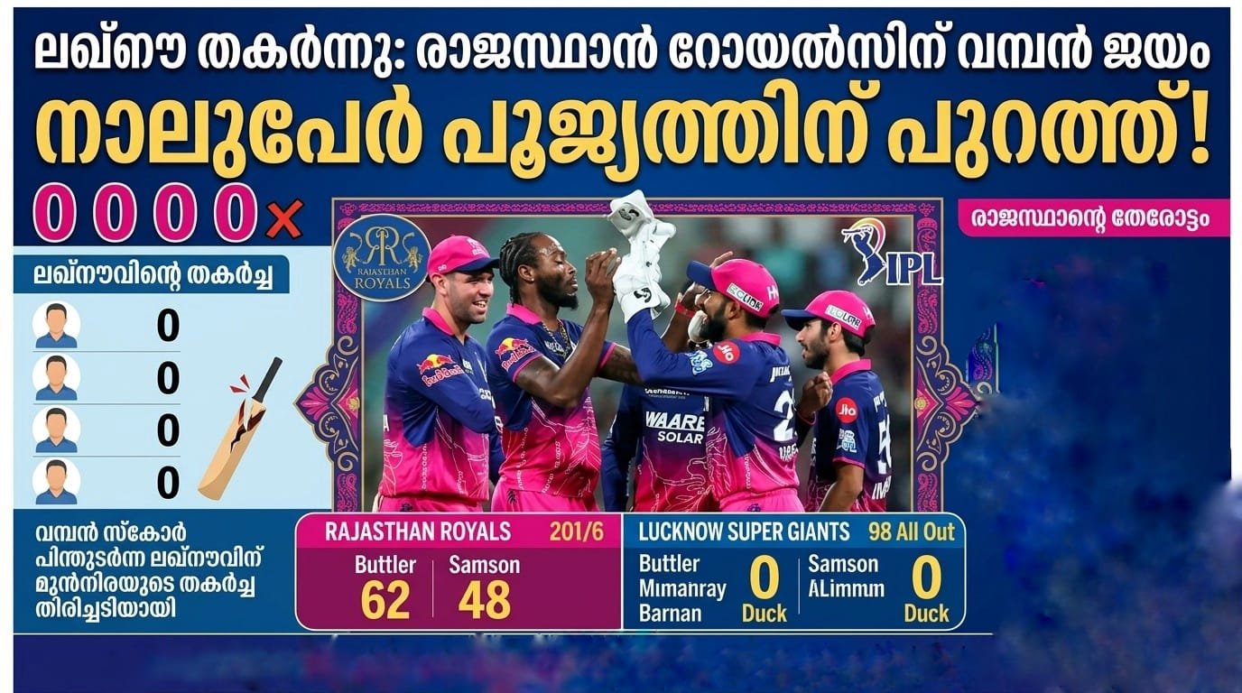 ബൗളർമാർ ആധിപത്യം പുലർത്തിയ മത്സരത്തിൽ ലഖ്‌നൗ സൂപ്പർ ജയന്റ്‌സിനെ 40 റൺസിന് തോൽപിച്ച് രാജസ്ഥാൻ റോയൽസ് ആവേശജയം നേടി. ആദ്യം ബാറ്റ് ചെയ്ത രാജസ്ഥാൻ, രവീന്ദ്ര ജഡേജയുടെ (43*) മികവിൽ 159 റൺസെടുത്തു. ലഖ്‌നൗവിനായി ഷമി, പ്രിൻസ് യാദവ്, മൊഹ്സിൻ ഖാൻ എന്നിവർ രണ്ട് വിക്കറ്റ്വീതം വീഴ്ത്തിയെങ്കിലും ബാറ്റിങ് നിര തകർന്നതോടെ അവർ പരാജയം സമ്മതിച്ചു.