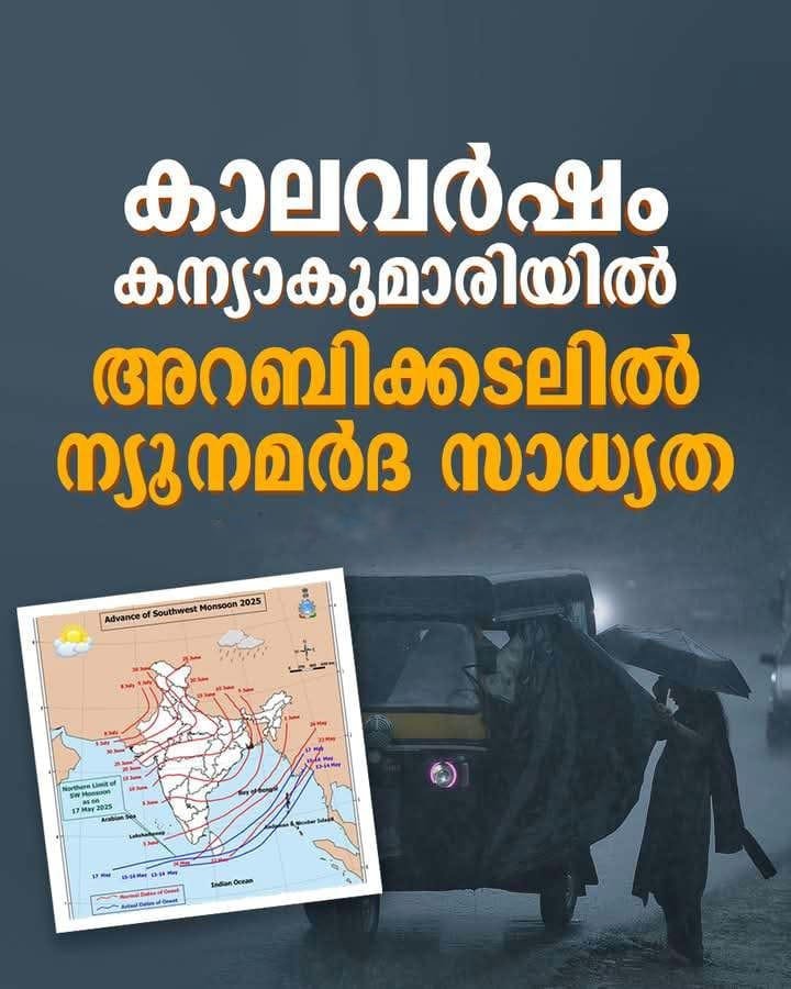 തിരുവനന്തപുരം: 2025 മെയ് പതിമൂന്നോടു (13/05/2025) കൂടി ഇത്തവണത്തെ കാലവർഷം തെക്കൻ ആൻഡമാൻ കടൽ, തെക്ക് കിഴക്കൻ ബംഗാൾ ഉൾക്കടൽ, നിക്കോബാർ ദ്വീപ് സമൂഹങ്ങളുടെ ചില ഭാഗങ്ങളിൽ എത്തിച്ചേരാൻ സാധ്യതയെന്ന് കേന്ദ്ര കാലാവസ്ഥാ വകുപ്പ് അറിയിച്ചു. സംസ്ഥാനത്ത് ഇന്ന് ഇടിമിന്നൽ ജാഗ്രതാ…