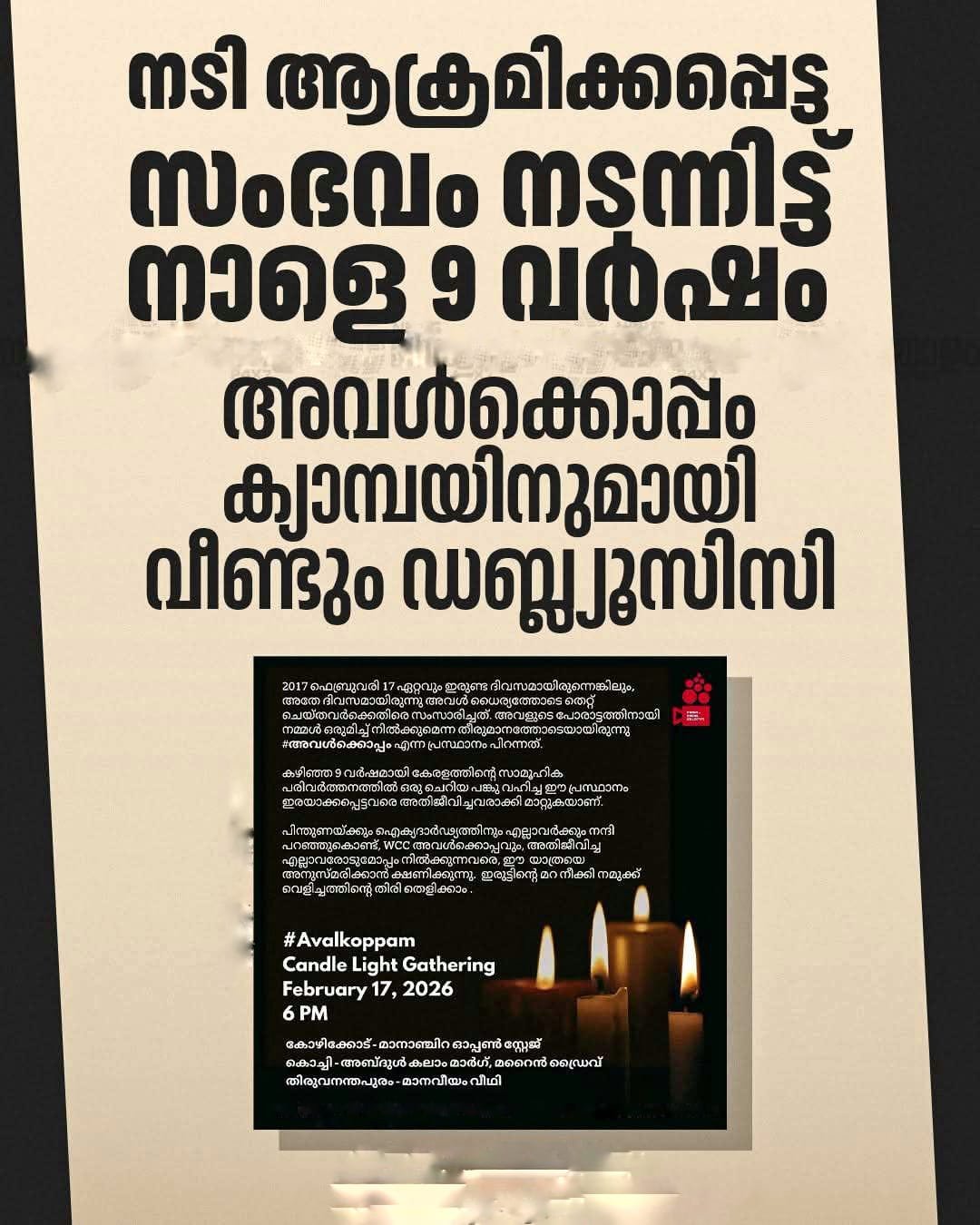 നടി ആക്രമിക്കപ്പെട്ടതിന്റെ ഒൻപതാം വാർഷികത്തോടനുബന്ധിച്ച് ‘അവൾക്കൊപ്പം’ ക്യാമ്പയിനുമായി ഡബ്ല്യൂസിസി (WCC) വീണ്ടും രംഗത്ത്. ഇതിന്റെ ഭാഗമായി കോഴിക്കോട് മാനാഞ്ചിറ, എറണാകുളം മറൈൻ ഡ്രൈവ്, തിരുവനന്തപുരം മാനവീയം വീഥി എന്നിവിടങ്ങളിൽ മെഴുകിതിരി തെളിയിച്ച് അതിജീവിതയ്ക്ക് ഐക്യദാർഢ്യം പ്രഖ്യാപിക്കും. നീതിക്കായുള്ള പോരാട്ടത്തിൽ ഉറച്ചുനിൽക്കുമെന്ന് പ്രഖ്യാപിച്ചുകൊണ്ടാണ്…