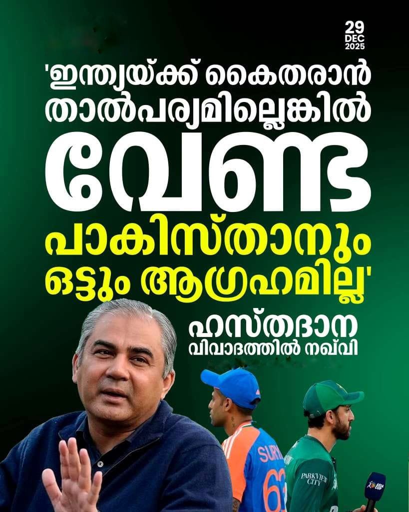 ഏഷ്യാ കപ്പിലെ ഹസ്തദാന വിവാദം വീണ്ടും ചര്ച്ചയാക്കി പാകിസ്താന് ക്രിക്കറ്റ് ബോര്ഡ് ചെയര്മാന് മുഹ്സിന് നഖ്വി. ഇന്ത്യയുമായുള്ള ക്രിക്കറ്റ് മത്സരങ്ങളിൽ ഹസ്തദാനം ചെയ്യുന്ന കാര്യത്തിൽ പാകിസ്താന് പ്രത്യേക താൽപര്യമില്ലെന്നാണ് ഏഷ്യൻ ക്രിക്കറ്റ് കൗൺസിൽ (എസിസി) ചെയർമാൻ കൂടിയായ നഖ്വി വ്യക്തമാക്കിയത്. ഇന്ത്യ…