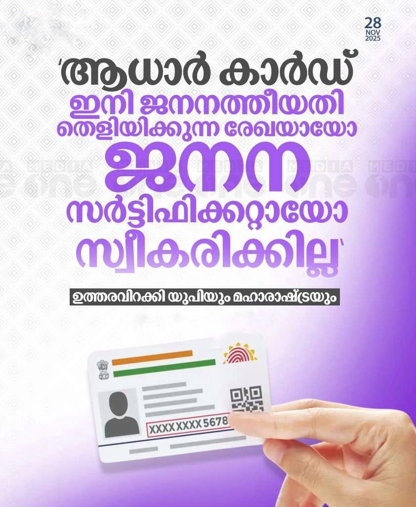 ആധാർ കാർഡ് ഇനി ജനനത്തീയതി തെളിയിക്കുന്ന രേഖയായോ ജനന സർട്ടിഫിക്കറ്റായോ സ്വീകരിക്കില്ല ഉത്തരവിറക്കി യുപിയും മഹാരാഷ്ട്രയും
