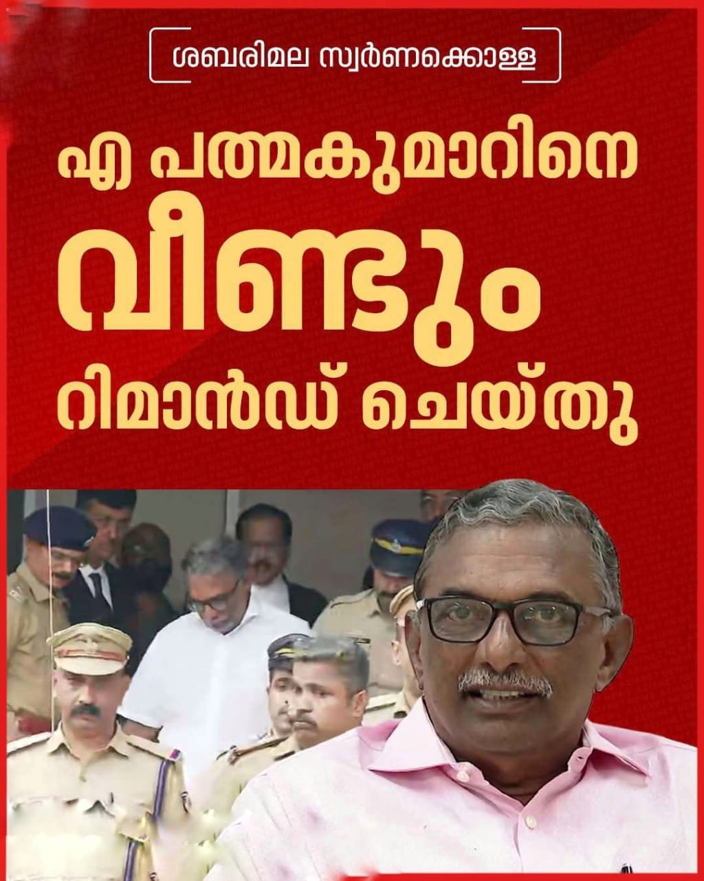 ശബരിമല സ്വർണക്കൊള്ള പത്മകുമാറിനെ വീണ്ടും റിമാൻഡ് ചെയ്തു