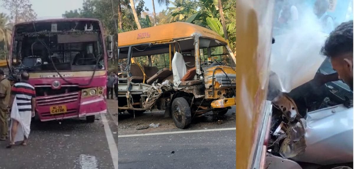 കോട്ടയത്ത് കൂട്ടഅപകടം സ്കൂൾ ബസും സ്വകാര്യബസും കാറും കൂട്ടിയിടിച്ചു