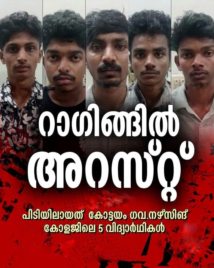 കോട്ടയം മെഡി കോളജ് നഴ്സിങ് കോളജിലെ റാഗിങ് അഞ്ച് വിദ്യാർഥികൾ അറസ്റ്റിൽ