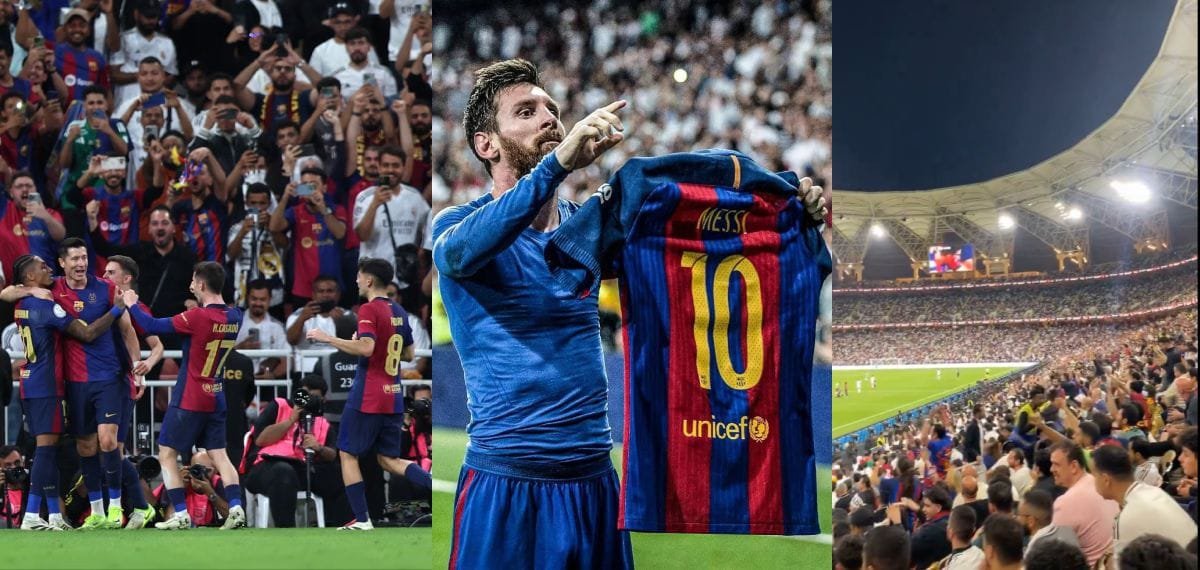 റയല് മാഡ്രിഡിനെതിരായ സ്പാനിഷ് സൂപ്പര് കപ്പ് ഫൈനലിനിടെ ‘മെസ്സി… മെസ്സി’ ചാന്റുകളുമായി ബാഴ്സലോണ ആരാധകര്. എല് ക്ലാസിക്കോയില് ത്രില്ലര് വിജയം സ്വന്തമാക്കിയ ബാഴ്സ കിരീടമുയര്ത്തുകയും ചെയ്തിരുന്നു. ജിദ്ദയിലെ കിങ് അബ്ദുള്ള സ്പോര്ട്സ് സ്റ്റേഡിയത്തില് നടന്ന മത്സരത്തില് രണ്ടിനെതിരെ അഞ്ച് ഗോളുകള്ക്കാണ് ബാഴ്സ…