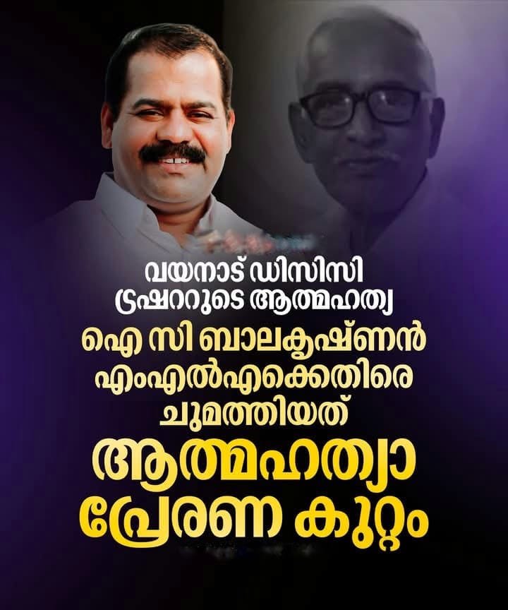 വയനാട് ഡിസിസി ട്രഷററുടെ മരണം ഐ സി ബാലകൃഷ്ണന് എംഎല്എ പ്രതി