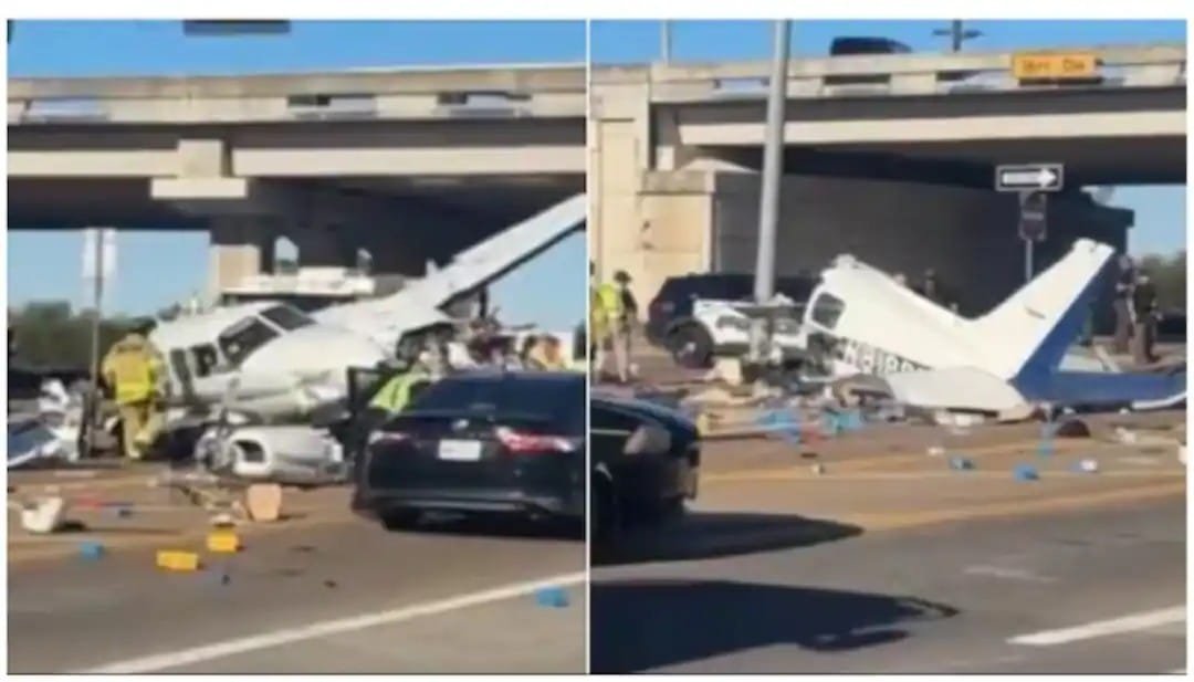 തിരക്കേറിയ ഹൈവേയിൽ ലാൻഡ് ചെയ്ത വിമാനം മൂന്ന് കാറുകൾക്ക് മുകളിലേക്ക് ഇടിച്ചുകയറി തകർന്നു നാല് പേർക്ക് പരിക്ക്